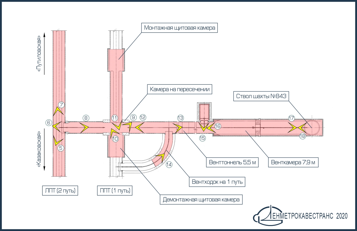 13. Налево уходит вентходок для вентиляции ППТ (1 пути):