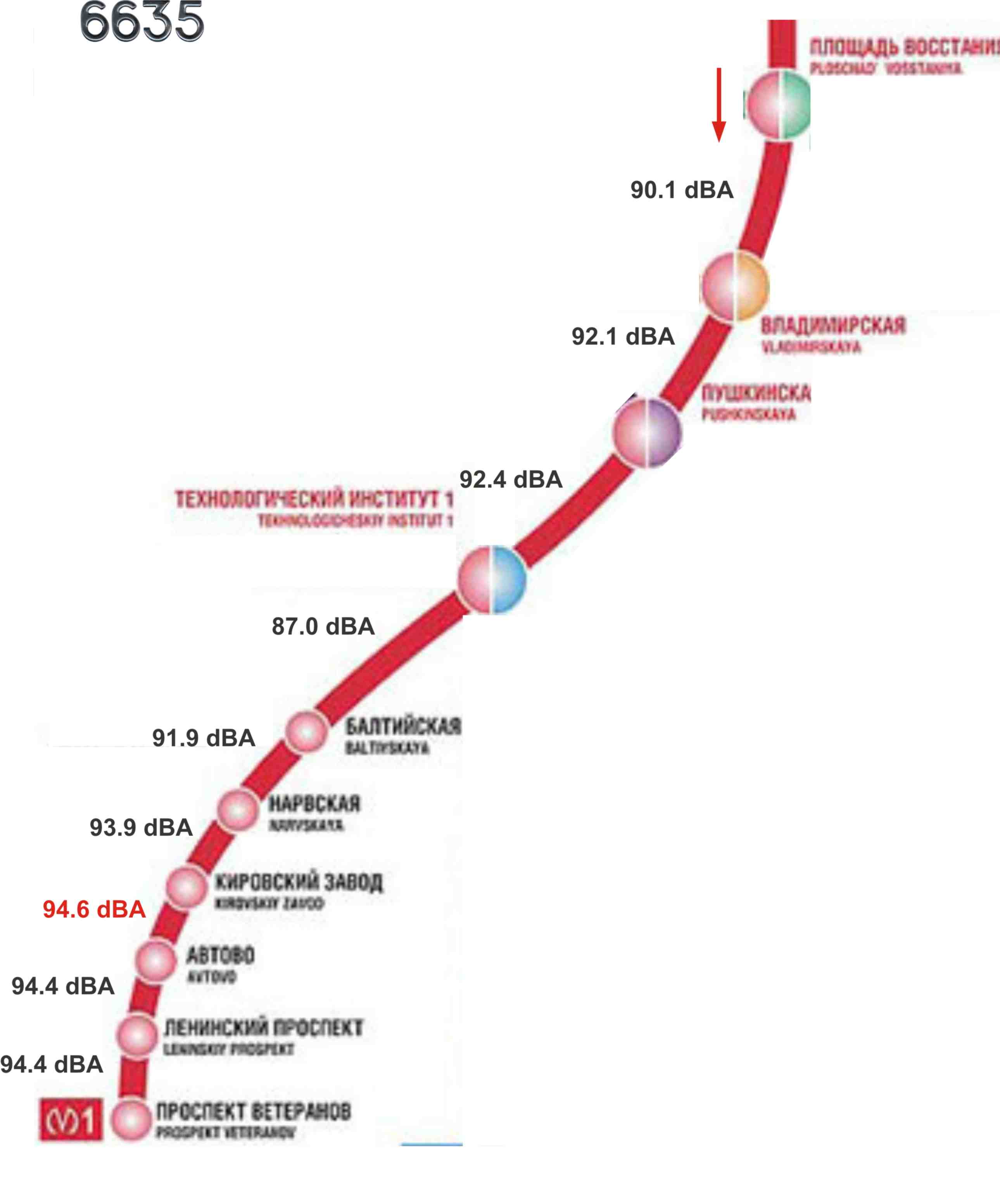 Итак, очередной замер. На этот раз в вагоне 6635 (4-й от головы), промежуточный, не модернизирован. Маршрут: пл. Восстания-пр. Ветеранов.
