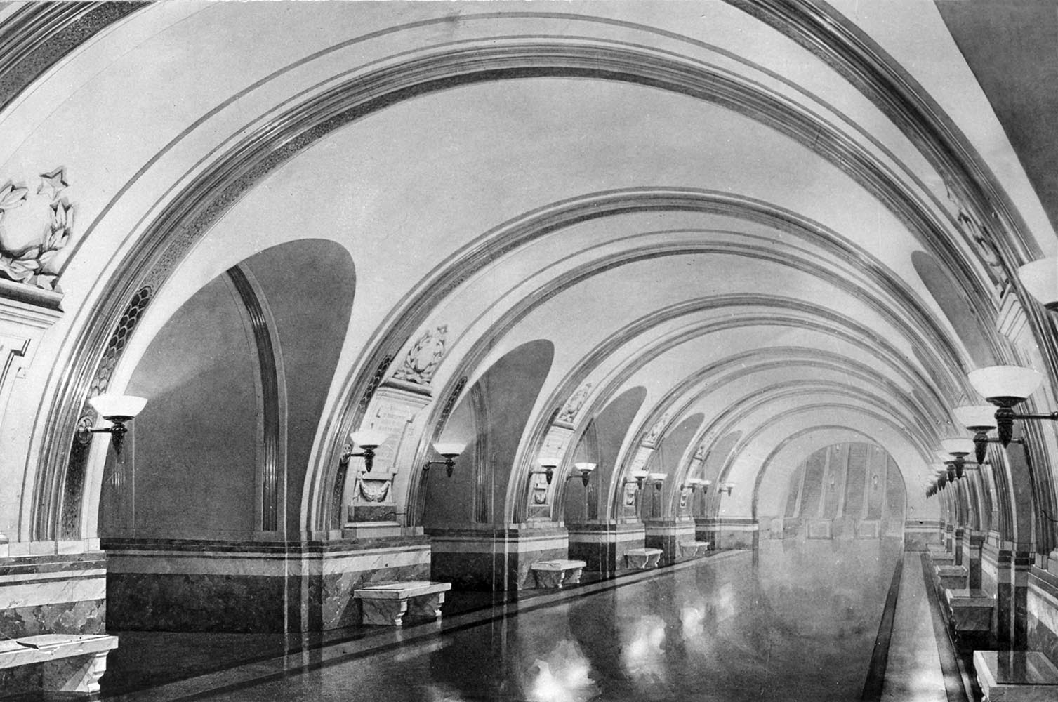 А теперь бонусы! Живопись — чтобы не разбрасывать по темам, выложу здесь самые интересные на мой взгляд репродукции картин из всё того же альбома (их там много, есть и конкретные станции, и просто сюжеты из жизни и строительства метро — так что спрашивайте, охотно расскажу и покажу что-нибудь ещё)