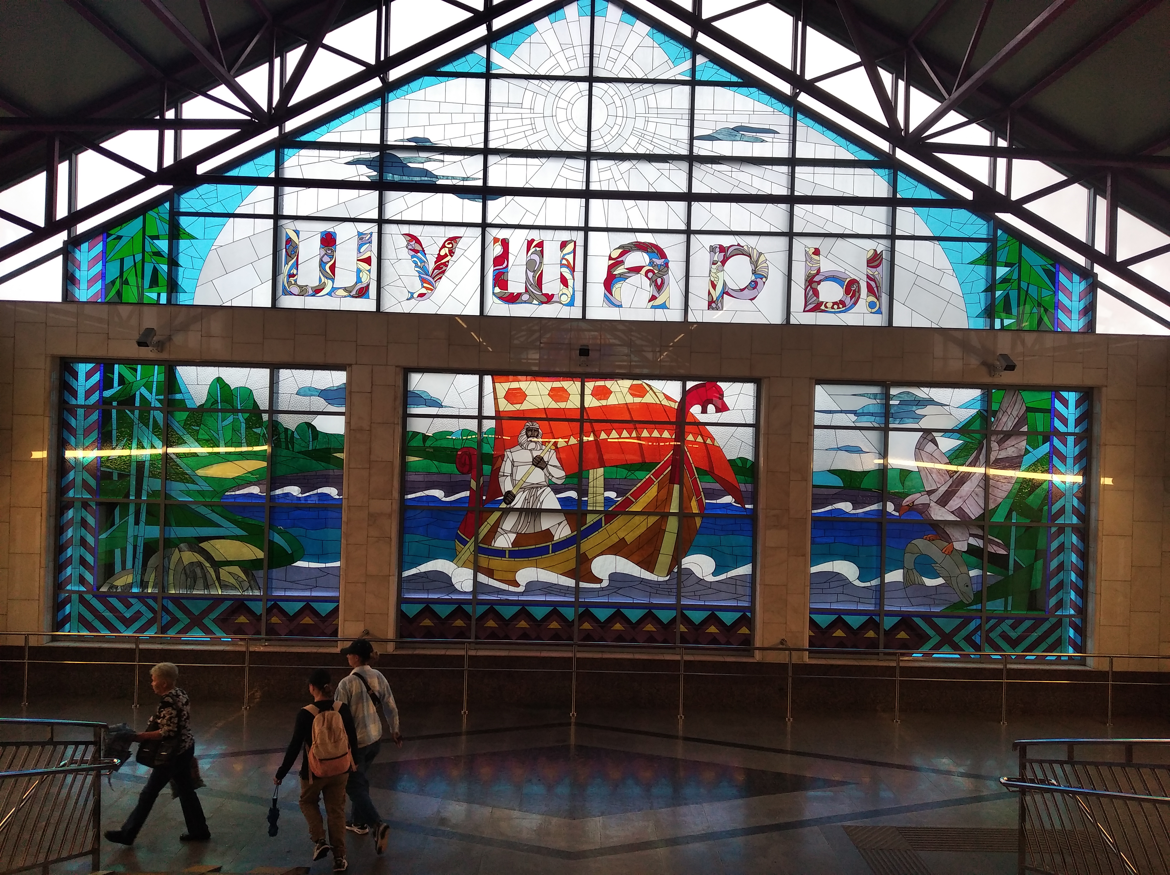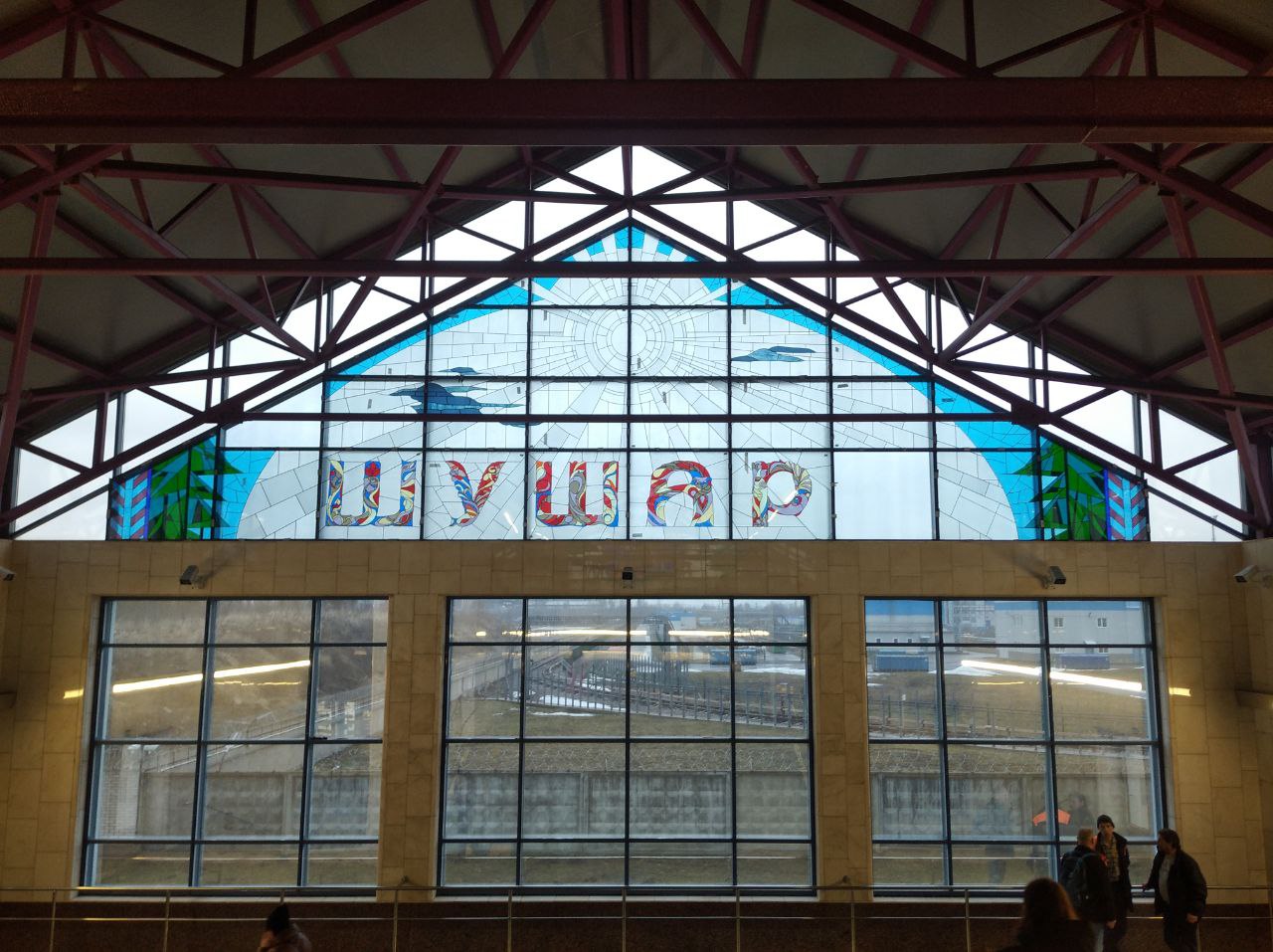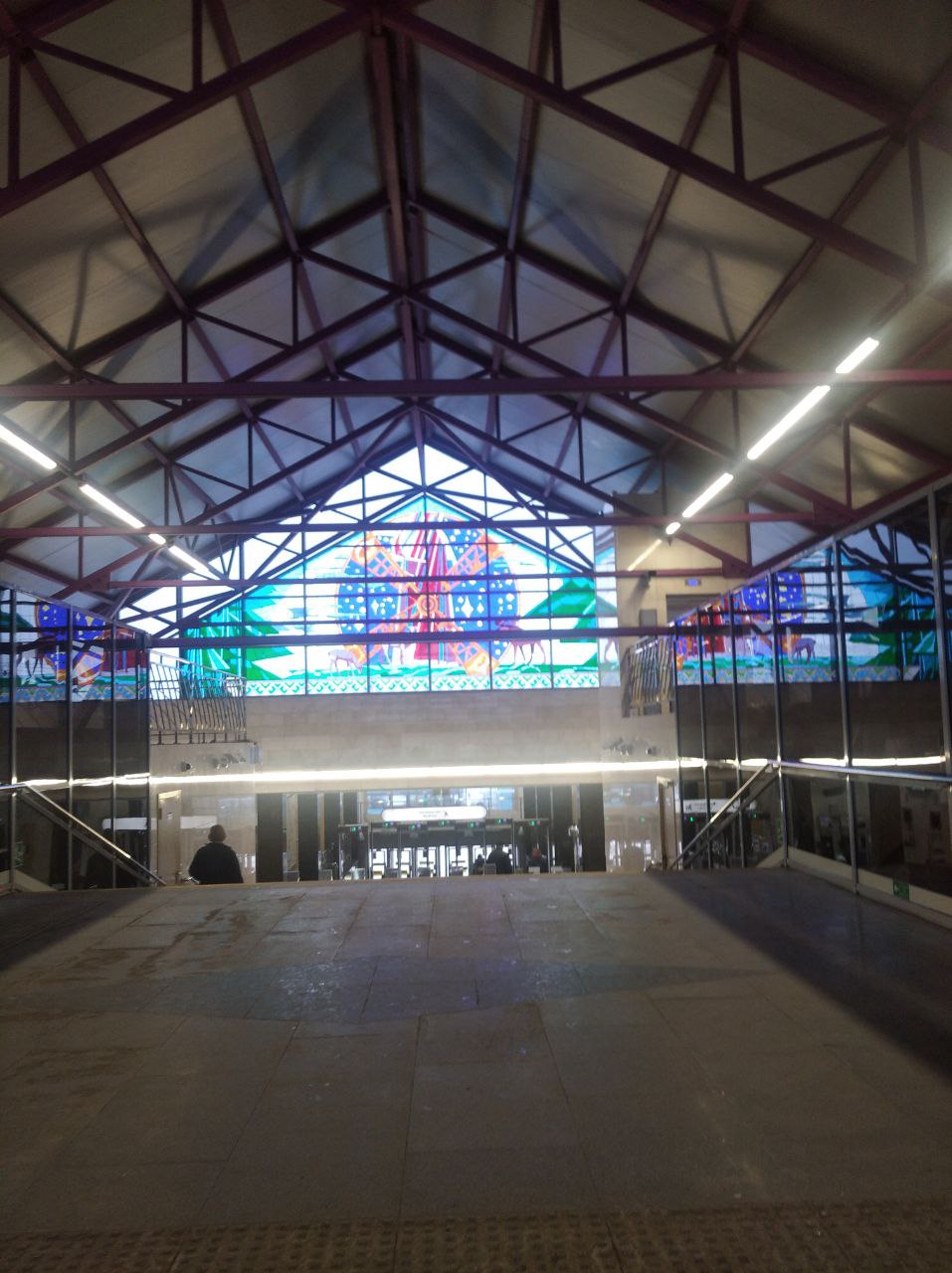 Кстати витраж с западной стороны вообще вне зоны видимости пассажиров. Его можно увидеть только обернувшись при переходе по мостику на посадку, встречного движения там нет. С обоих платформ тоже не видно