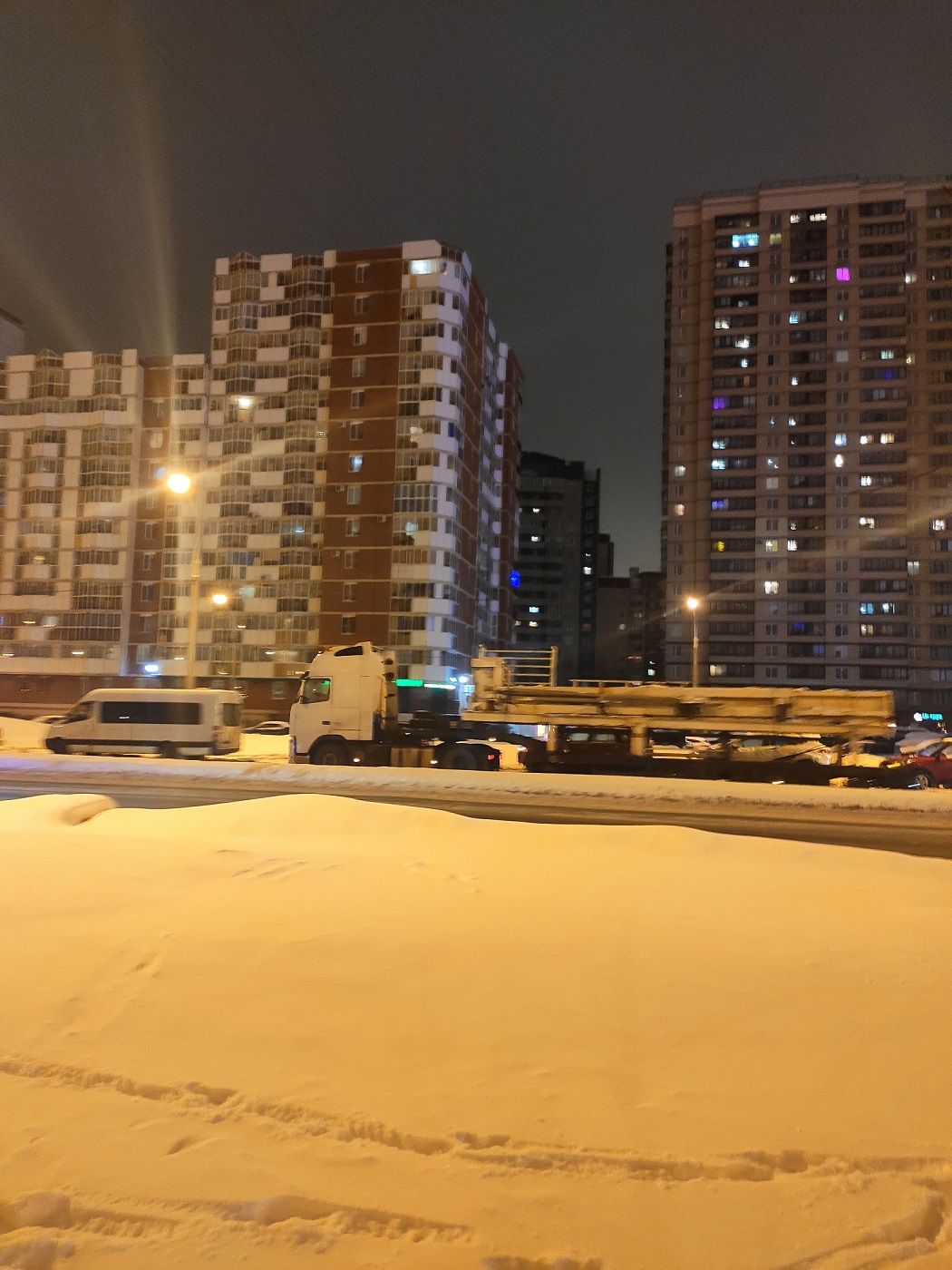 Не знаю, части это "Надежды" или нет, но сегодня в районе часа ночи со стороны ЗСД в сторону Туристской по Богатырскому пр. проследовали 2 "шаланды". Одна из них на фото. С Богатырского пр. повернули на Туристскую. Возможно это части "хвоста" щита?