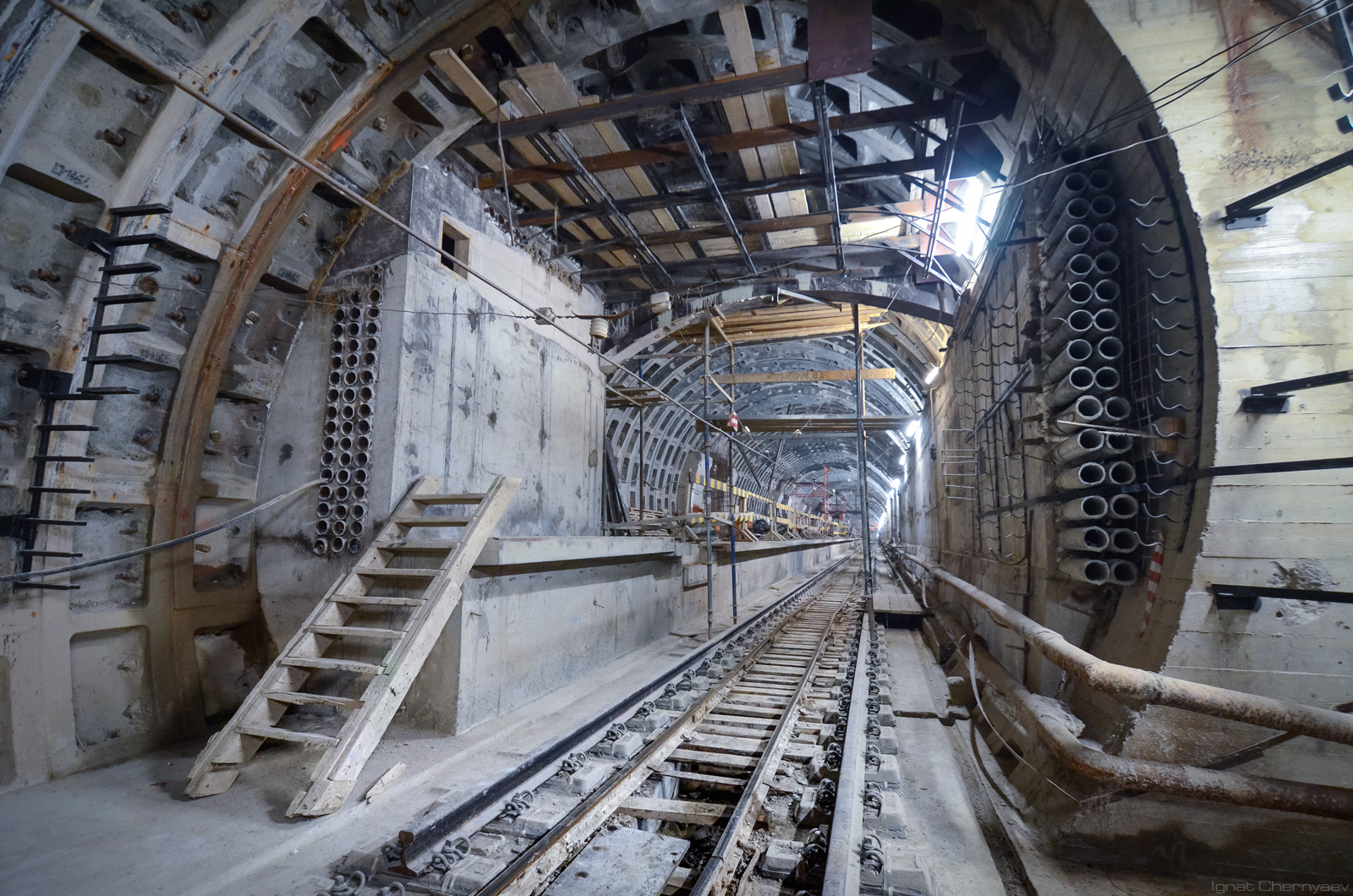 С пожарными требованиями не поспоришь, так что теперь ЛМГТ разрабатывает проект второго эвакуационного ходка, предлагая использовать в этой роли временные подходные тоннели № 1 и 2, которые изначально планировалось забутить. И всё бы ничего, но уровень пола подходного тоннеля № 2, построенного для выхода к натяжной камере, расположен ниже уровня правого станционного тоннеля. А это значит что часть ходка придётся перестраивать, разбирая свод и обходя станционный тоннель сверху, а потом городить безумные каскады лестниц с углами почти в 45 градусов. Особую пикантность ситуации придаёт то, что это всё находится ровно под Мариинским театром, а проходка именно таких ходков может вызвать серьёзные просадки грунта. В общем, упорные выступления кое-кого против строительства выхода на площадь «ради сохранения зданий театра и консерватории» ещё могут сыграть злую шутку :)