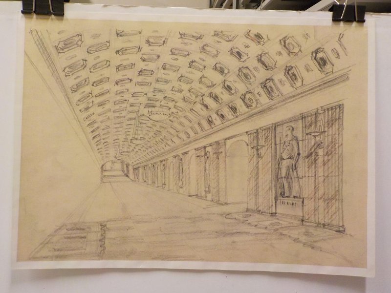 Эскиз «каменного» брата нынешней станции я уже выкладывал. А вот дополнительные материалы к нему. Бросается в глаза суженный подобно «Звенигородской» проход рядом с простенком. Судя по всему, путевые стены планировали отделать металлопластиком в любом случае