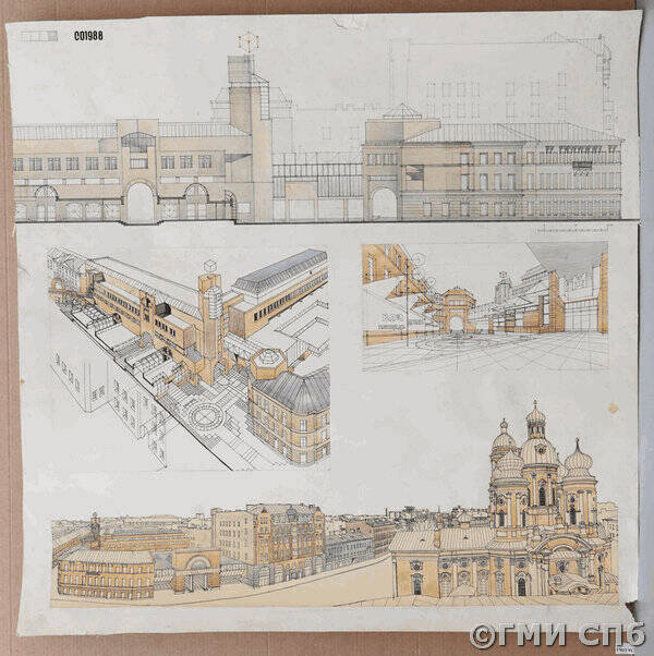 К проекту аэровокзала прилагается следующая подпись: «В нижней части листа — два четырехэтажных фасада в классицистическом стиле, окна первого этажа арочные, здесь располагаются административные помещения аэрофлота, касса, ресторан». Где предполагался вестибюль «Площади Мира-II», тогда ещё не определились
