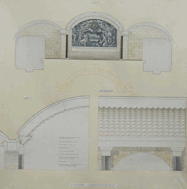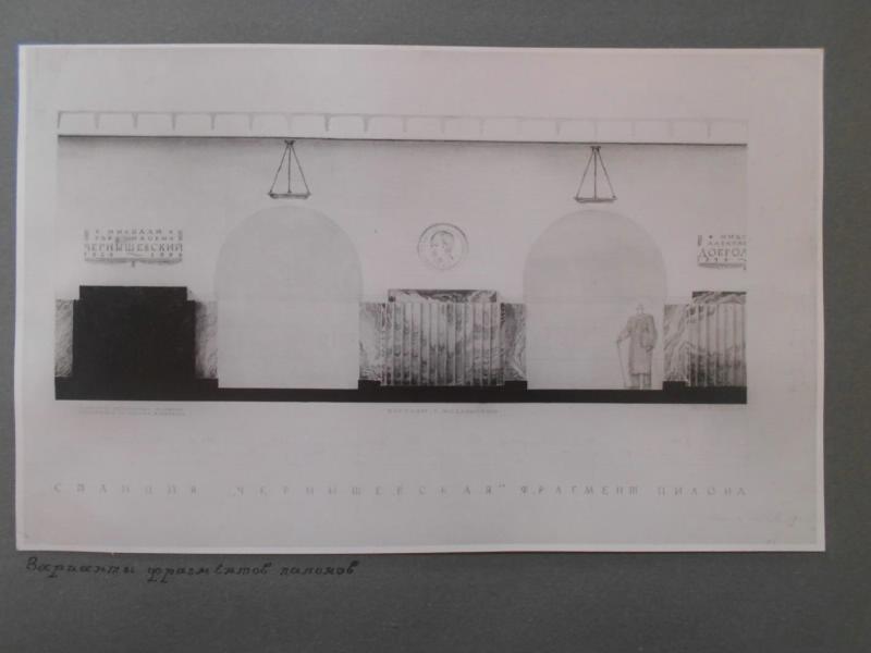 Эскиз «каменного» брата нынешней станции я уже выкладывал. А вот дополнительные материалы к нему. Бросается в глаза суженный подобно «Звенигородской» проход рядом с простенком. Судя по всему, путевые стены планировали отделать металлопластиком в любом случае