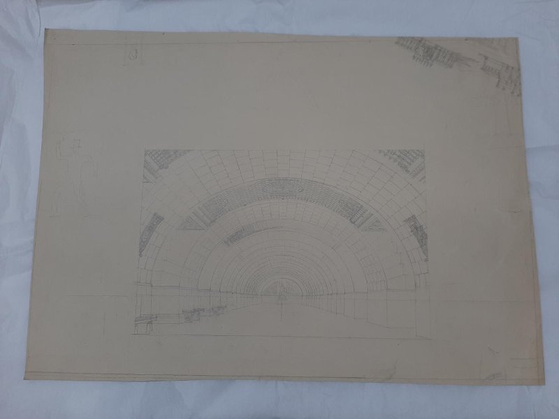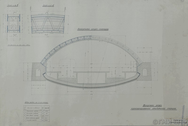 Как насчёт односводчатой станции? А если я скажу, что этот поперечный разрез датируется 1946-1947 годом? Неизвестно, правда, глубокая это станция или мелкая. Подписана как «Поперечный разрез трёхплатформенной односводчатой станции Ленинградского метрополитена», а в нижнем правом углу виднеется «Метропроект»