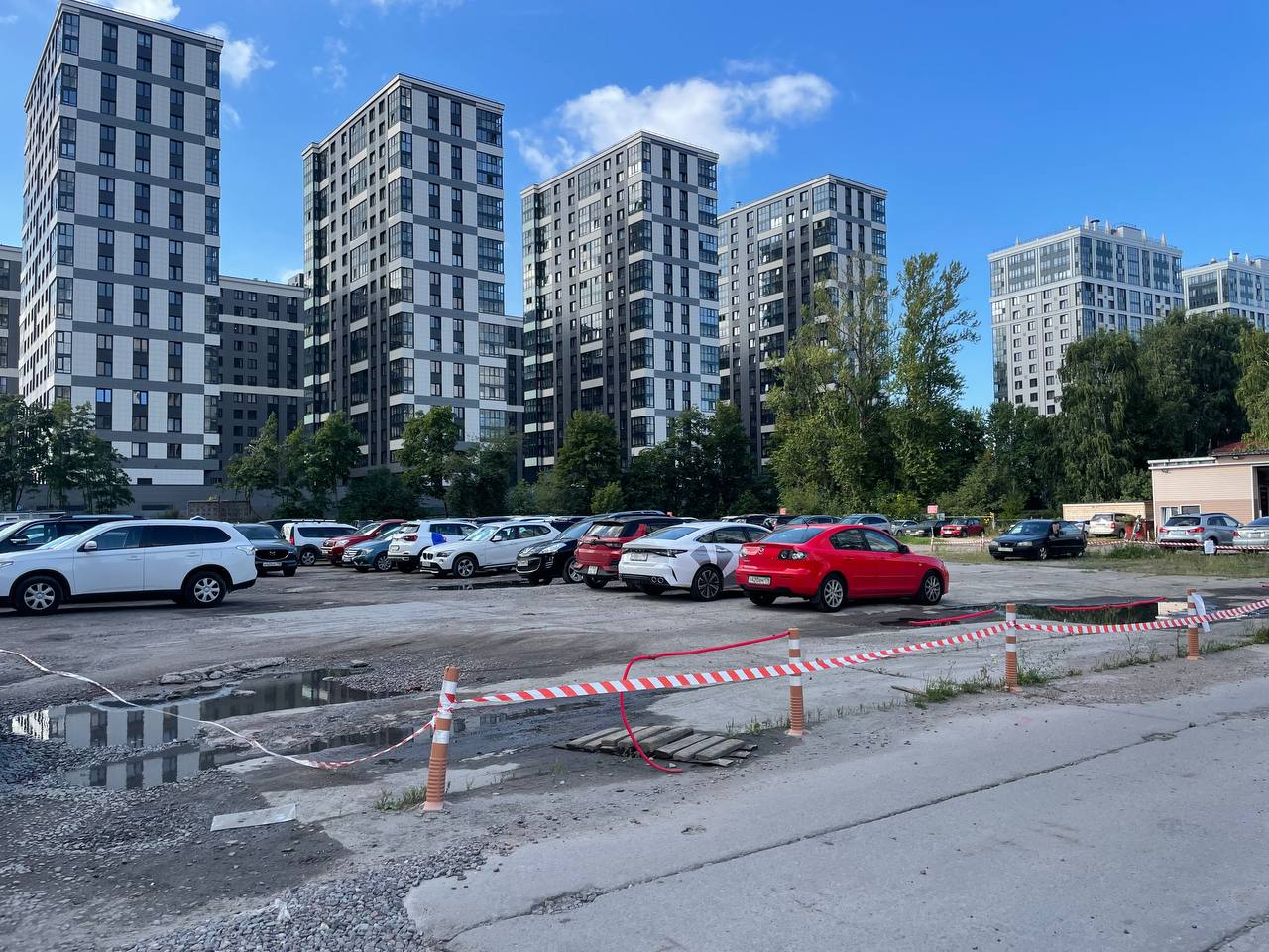 На площадку продолжают завозить строительные контейнеры, а также была огорожена территория и развешены сообщения с просьбой освободить место от автомобилей.