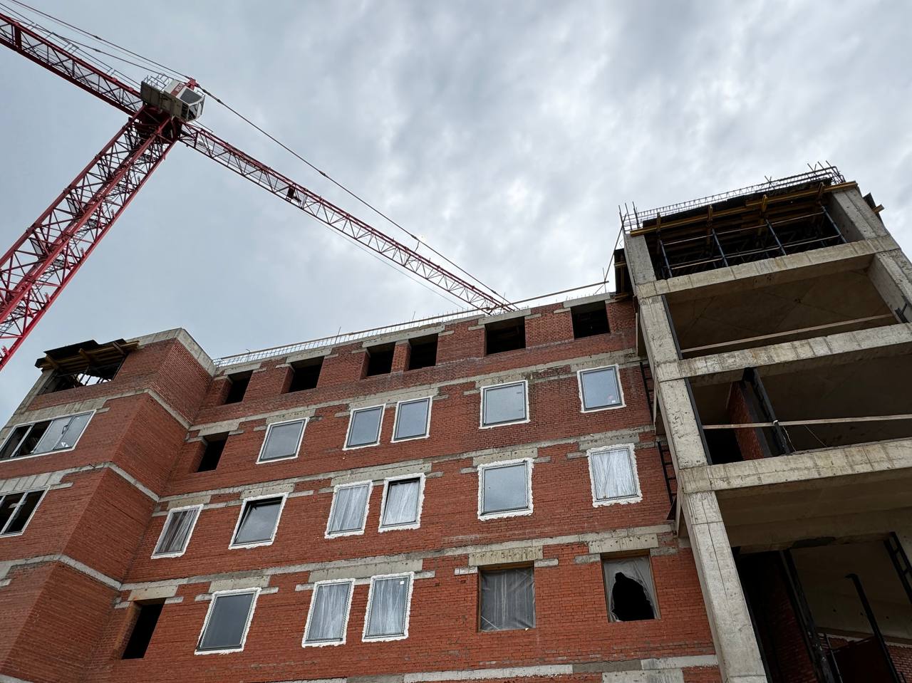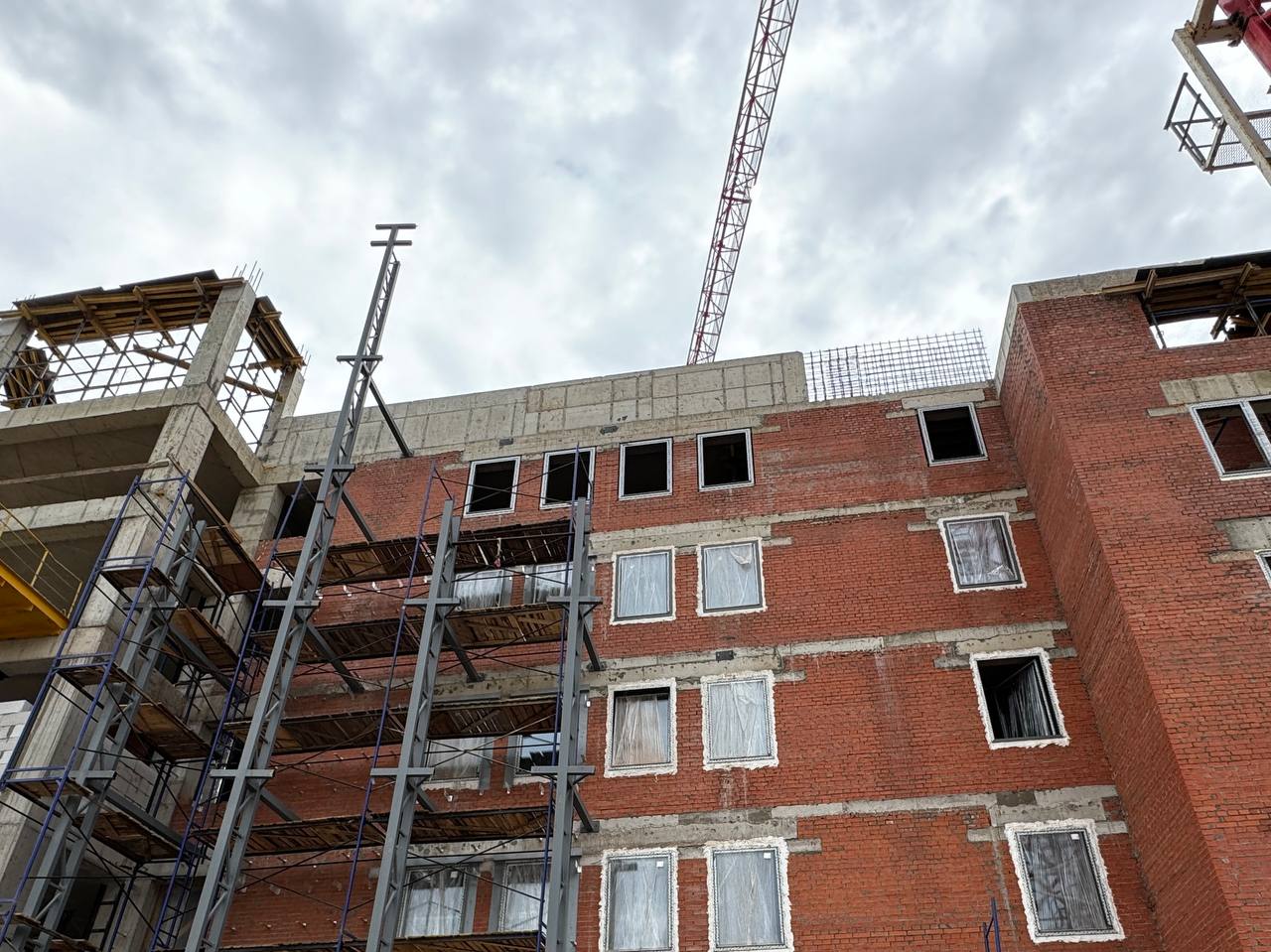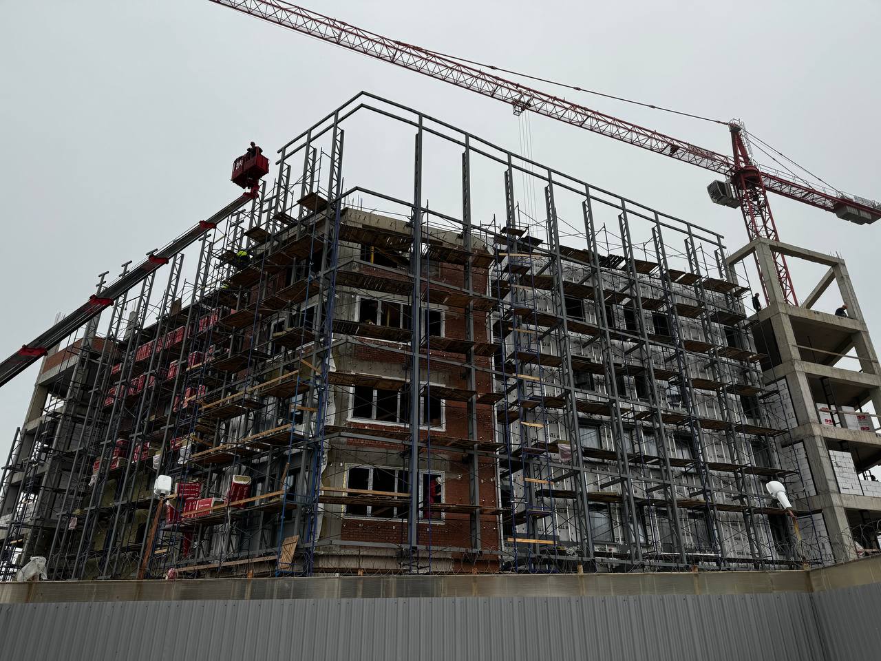 Стены здания достигли верхнего перекрытия 5 этажа, часть этого перекрытия уже забетонирована, а остающаяся часть армируется.
