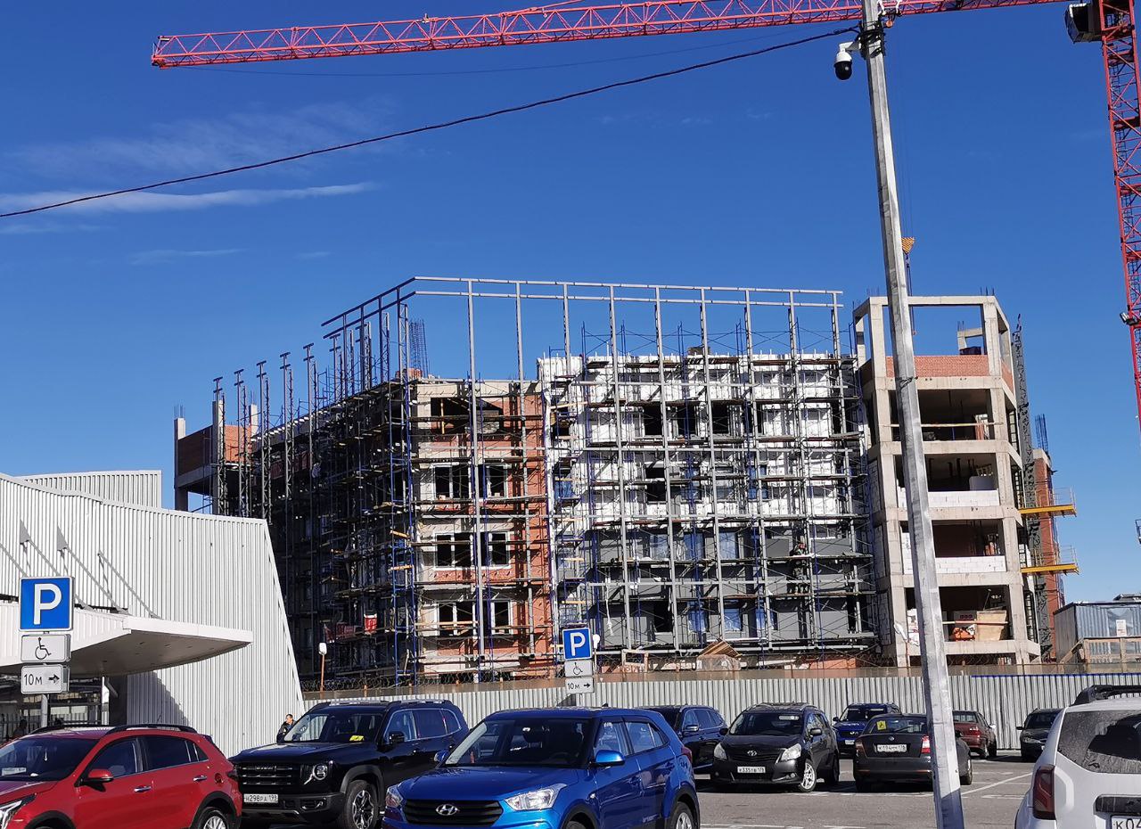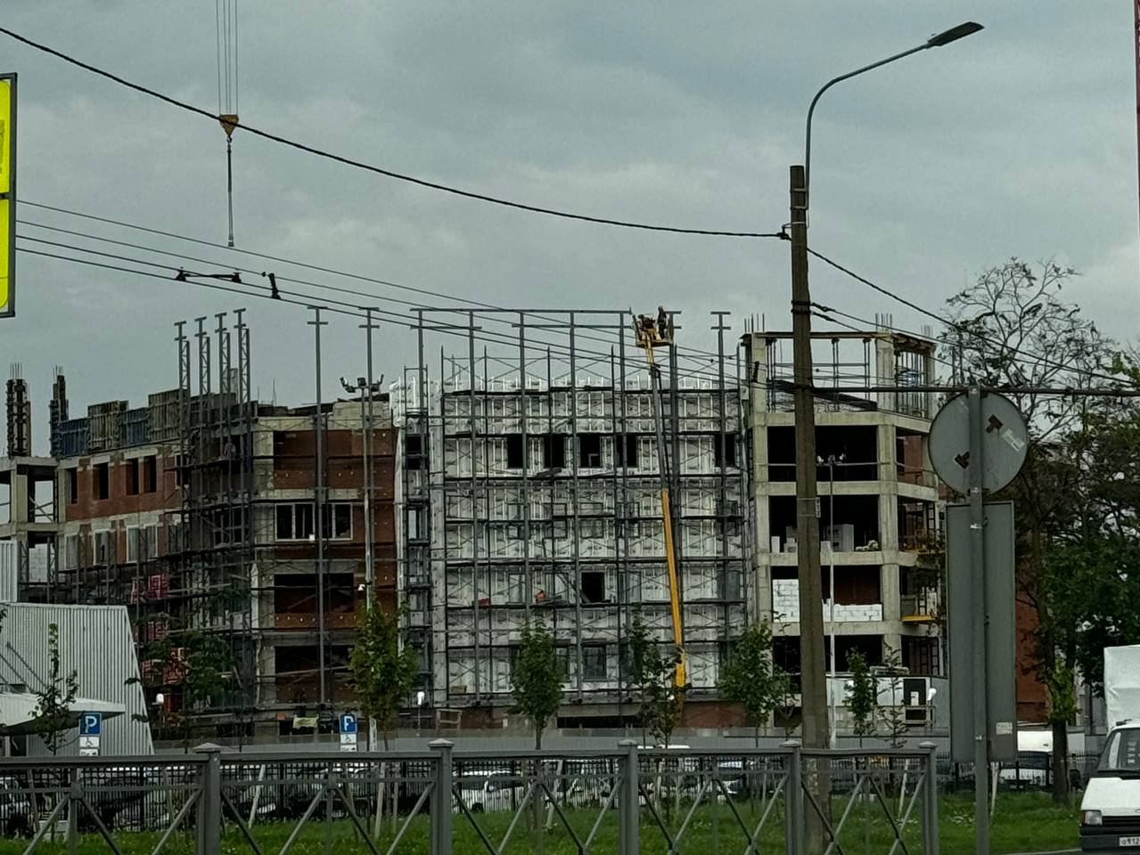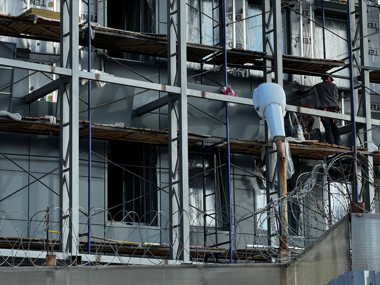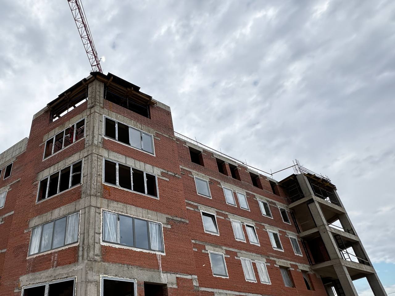 Стены здания достигли верхнего перекрытия 5 этажа, часть этого перекрытия уже забетонирована, а остающаяся часть армируется.
