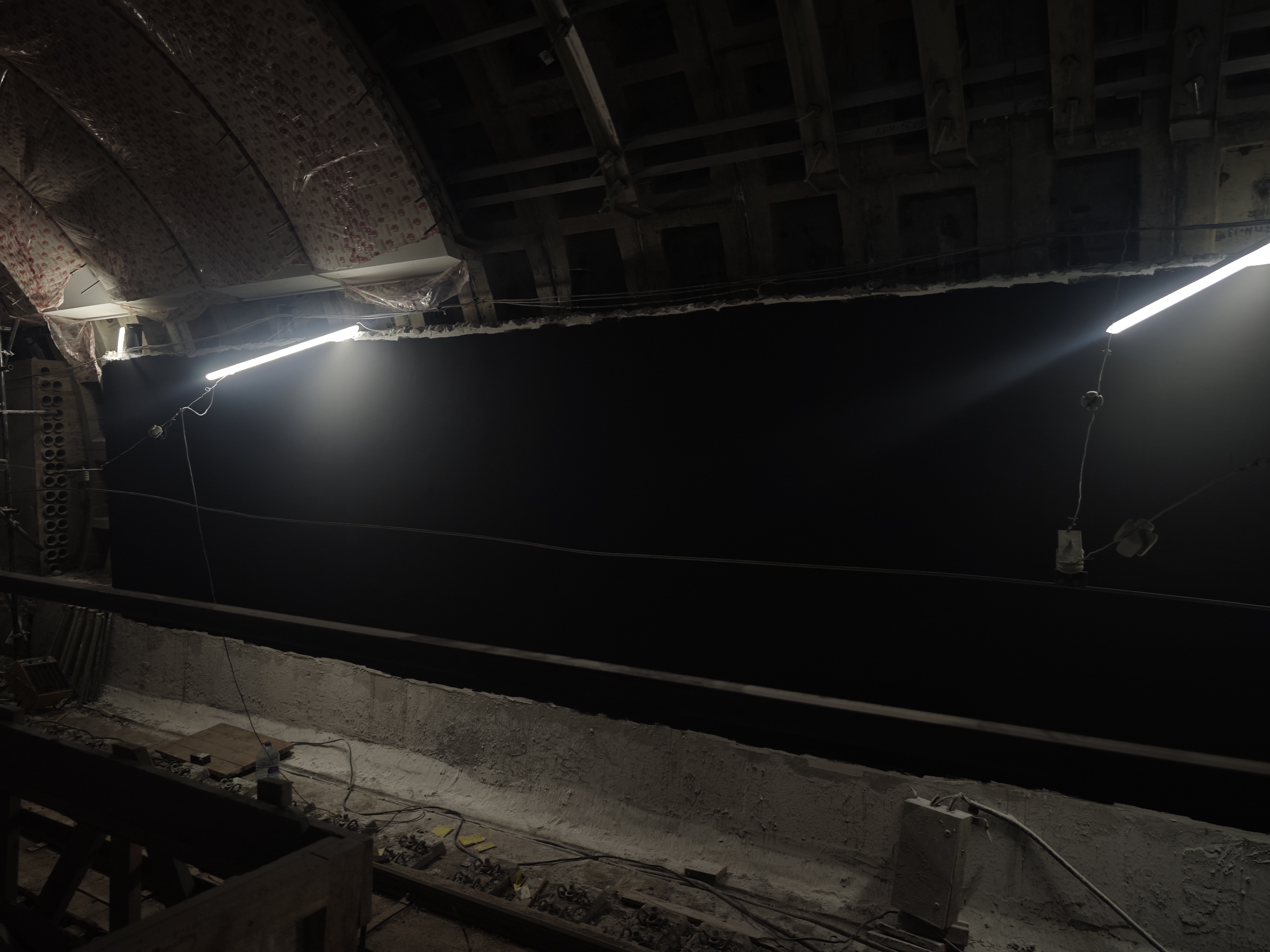 Поиск решения отделки путевой стены. В ПСТ смонтировали каркас на путевую стену, в ОСТАЛЬНОМ затукатурили, зашпаклевали и покрасили в чëрный цвет.