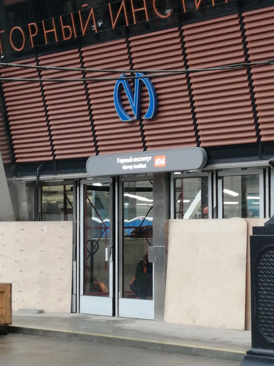 Наземные павильоны станции «Горный институт» продолжения Лахтинско-Правобережной (четвёртой) линии Петербургского метрополитена обзавелись информационными указателями необычного для петербургской подземки цвета оформления - серого.