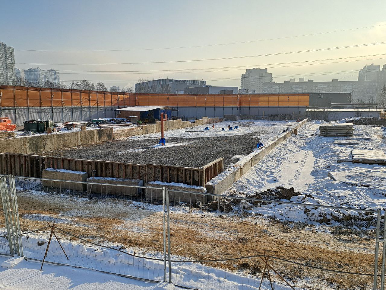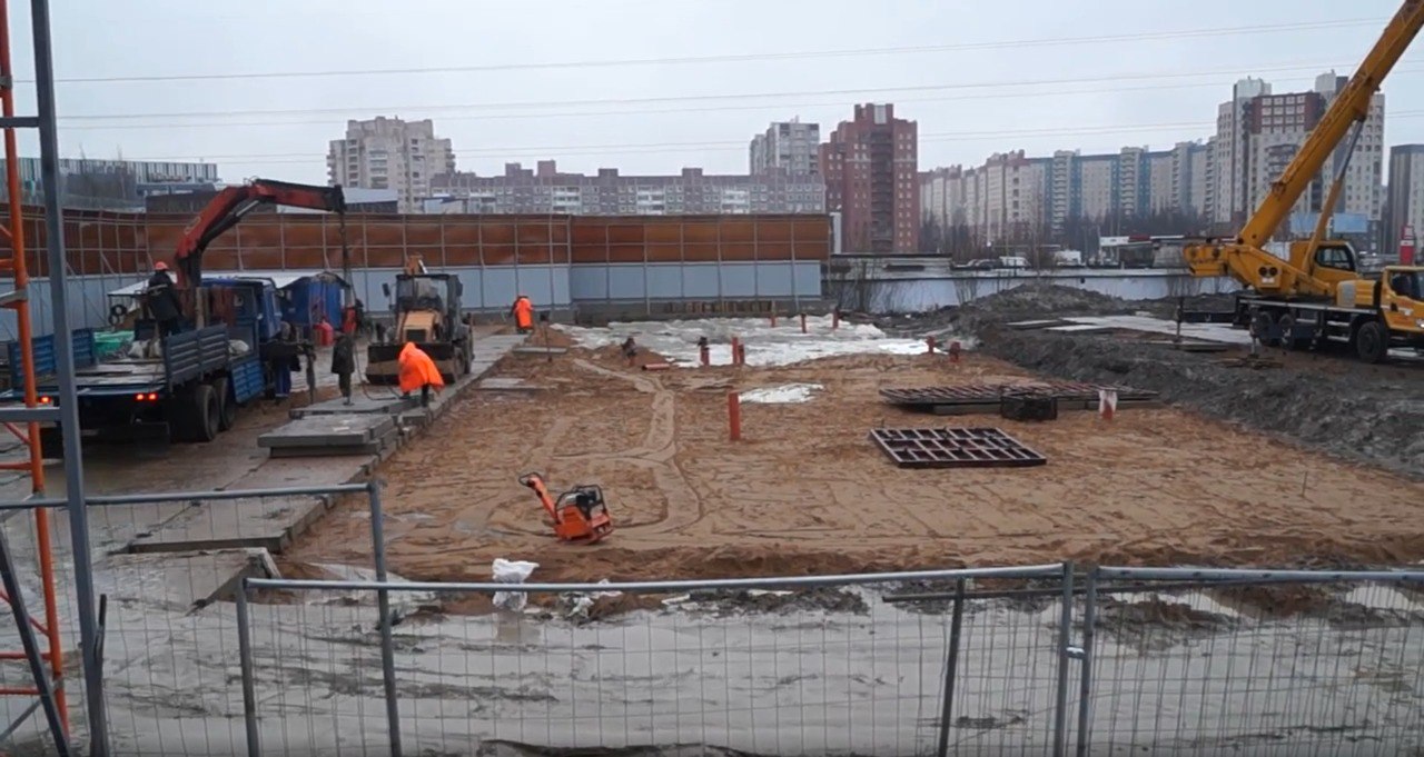 На месте строительной площадки производят работы по выравниванию участка, укладывают дорожные плиты, устанавливают ограждение, идут работы по подготовке основания для административно-бытового комплекса.