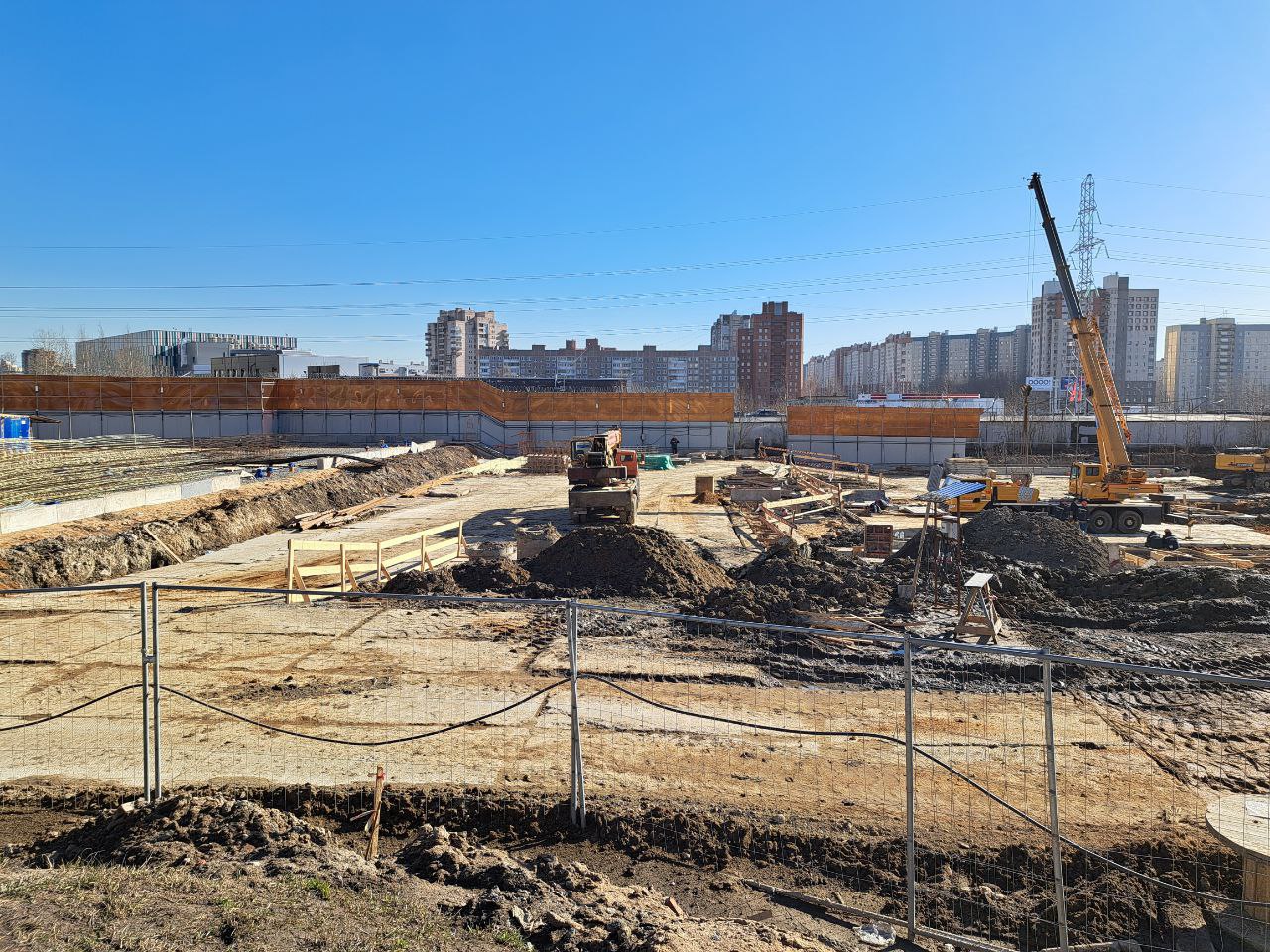 На строительной площадке в Приморском районе Санкт-Петербурга, рядом с пересечением Комендантского и Шуваловского проспектов, ведётся сооружение форшахты для стены в грунте.