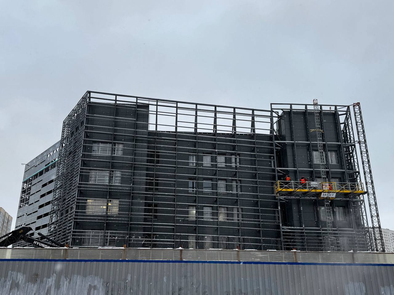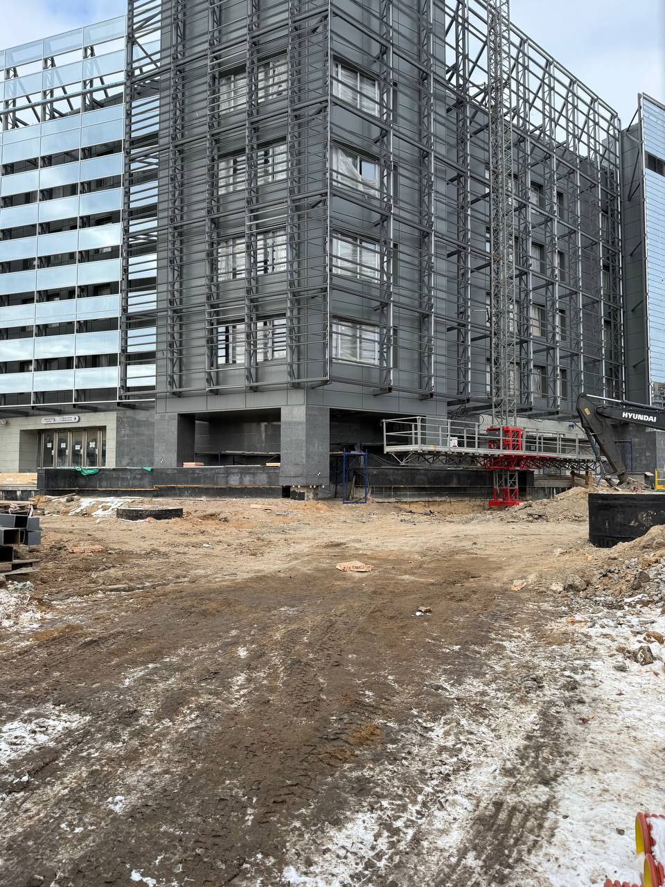 Идут работы на грани здания выходящей к перекрёстку проспекта маршала Жукова и улицы маршала Казакова.