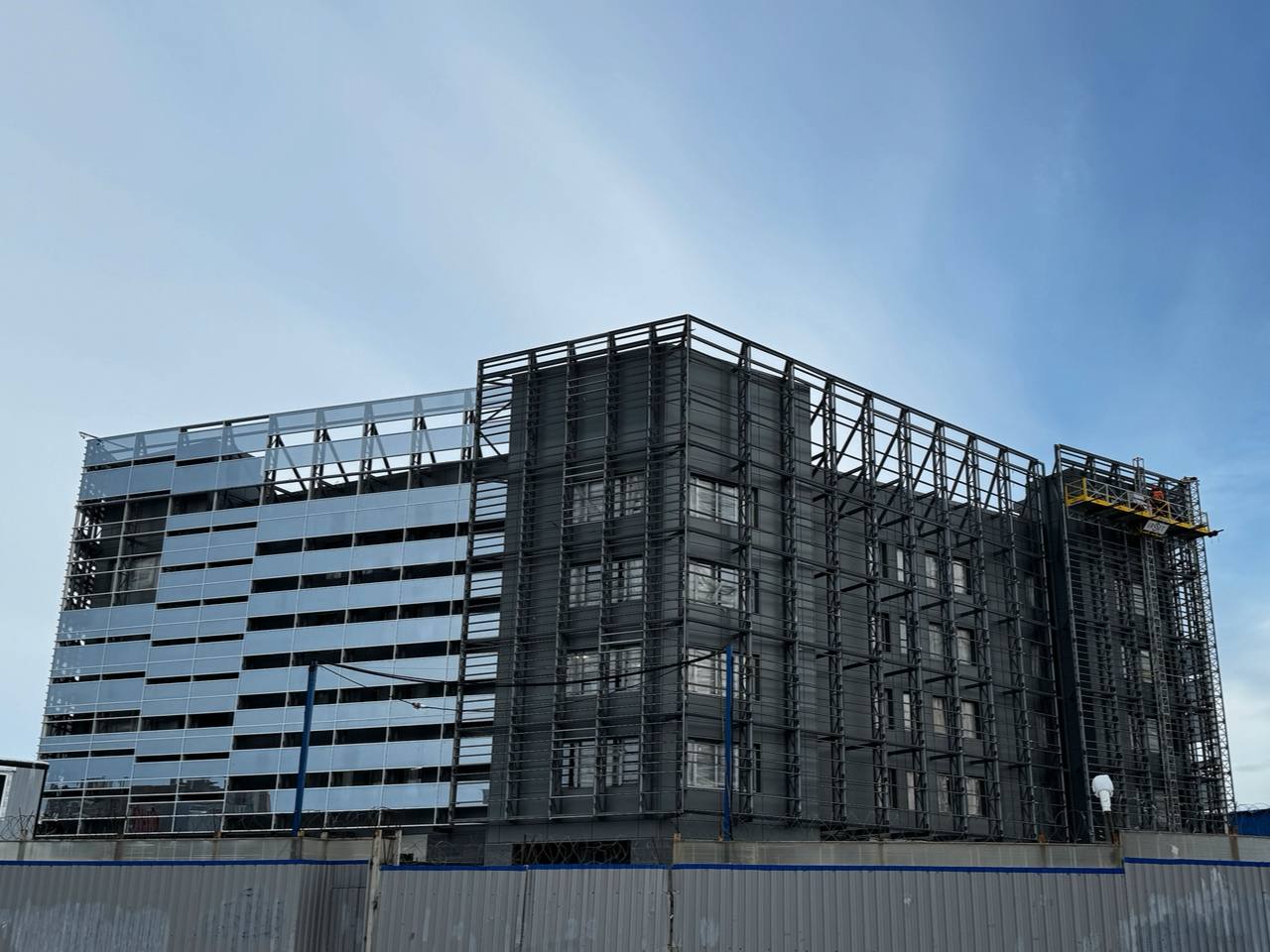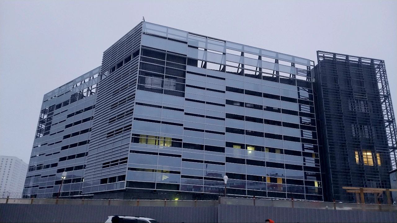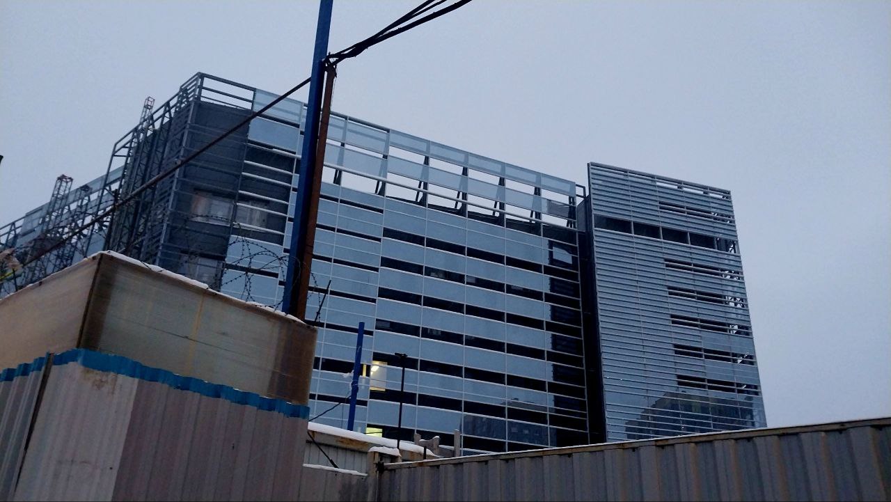 Завершаются работы по монтажу вентилируемого фасада. Продолжается установка стеклянного фальш-фасада.