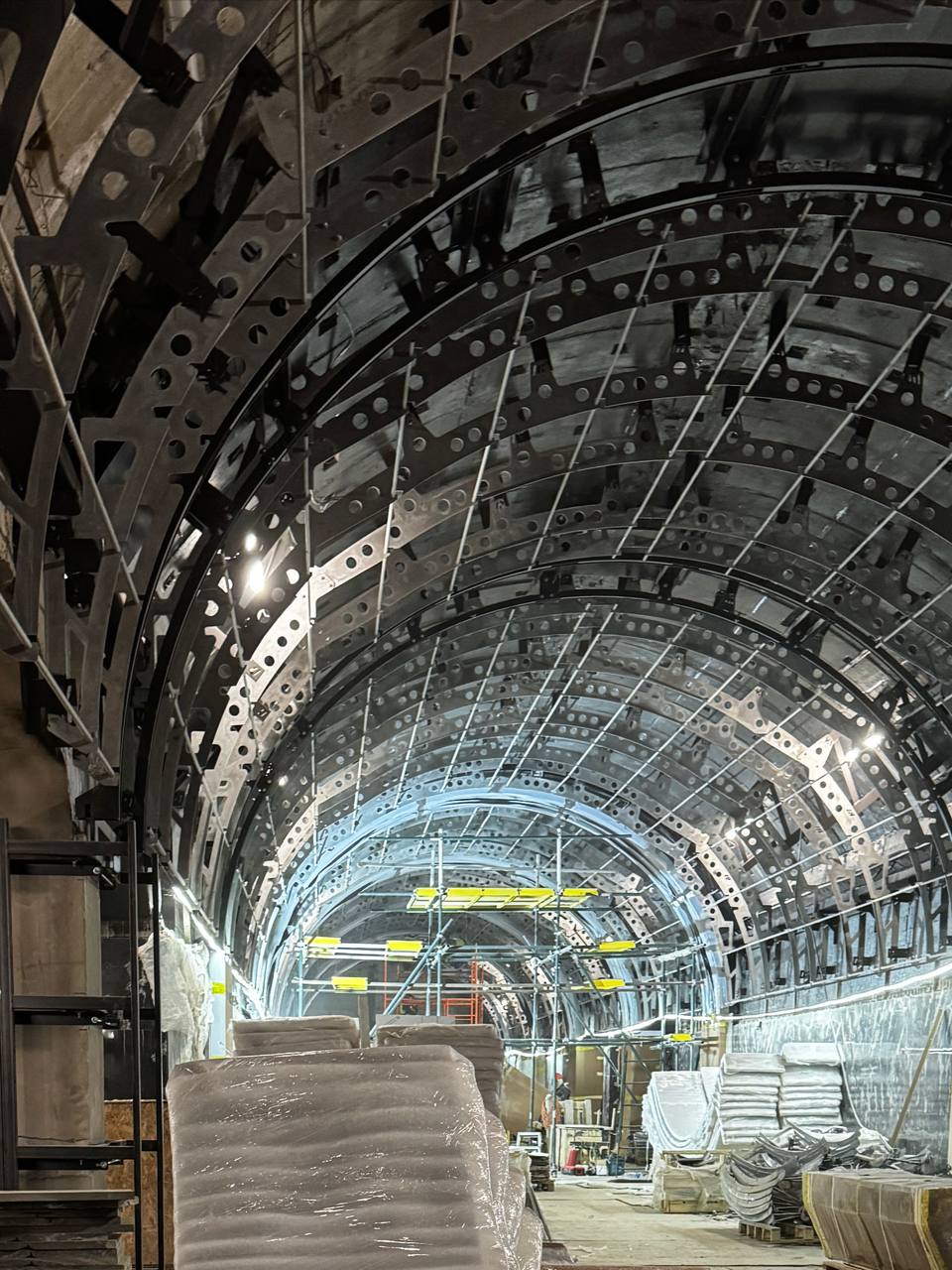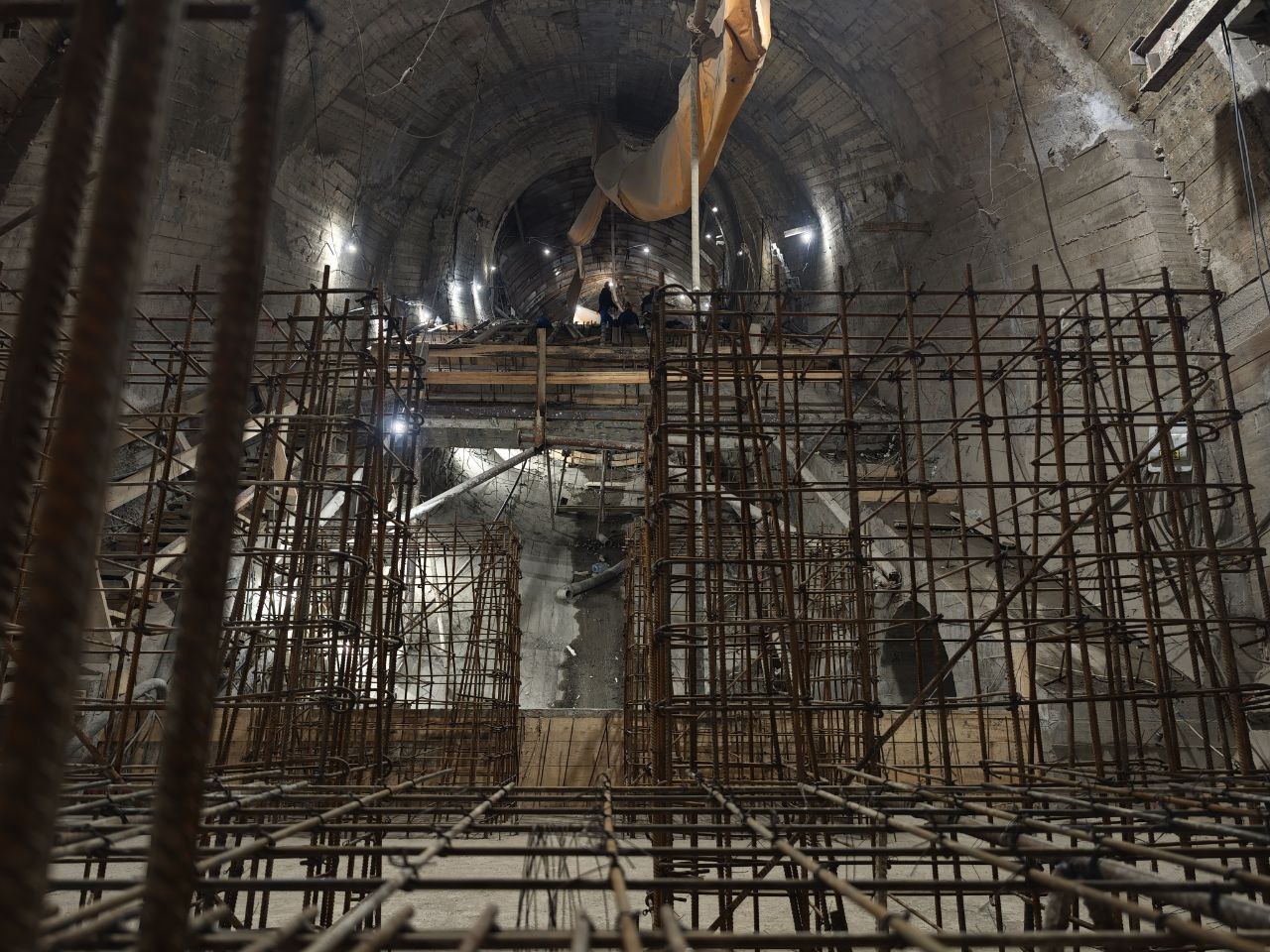 Сейчас здесь продолжается работа по устройству копра шахты. В дальнейшем весь комплекс, который здесь сооружается будем важной частью перехода между станциями «Кировский Завод» и «Путиловская».