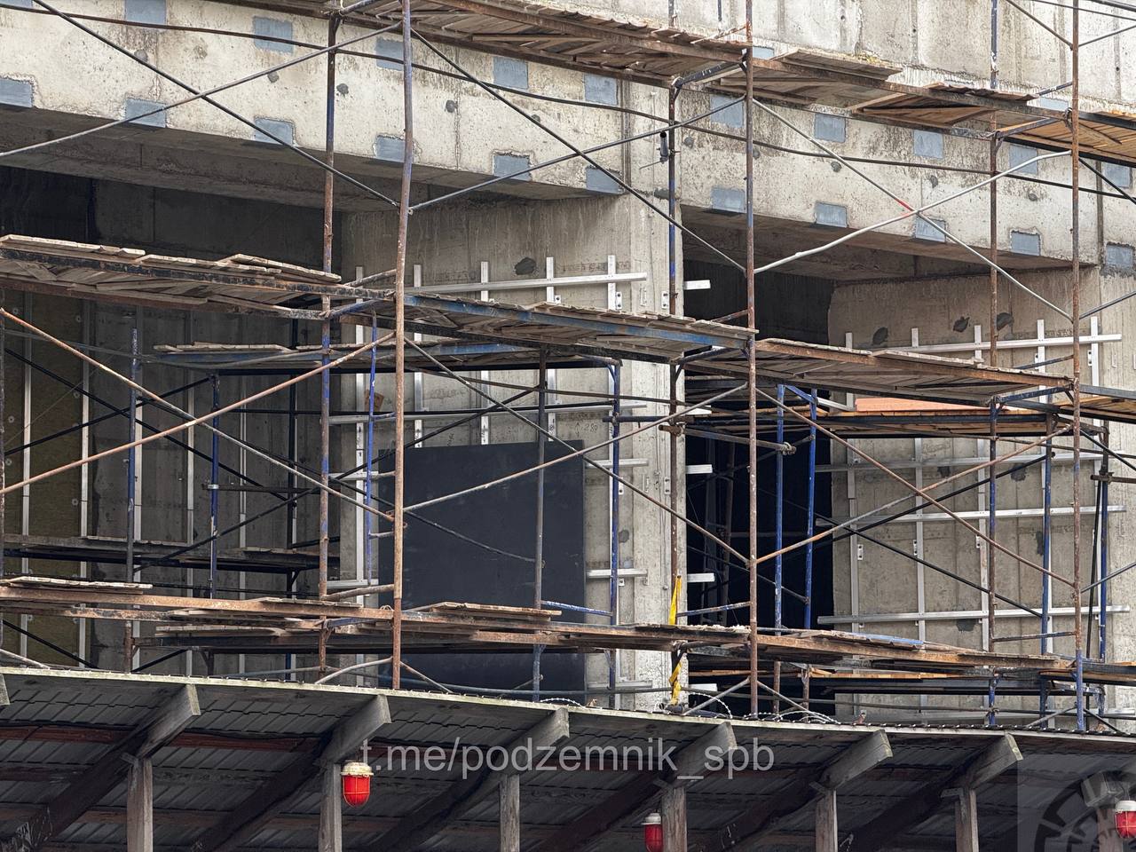 На строительстве вестибюля станции «Путиловская» Красносельско-Калининской линии Петербургского метрополитена продолжается отделка фасада вестибюля.