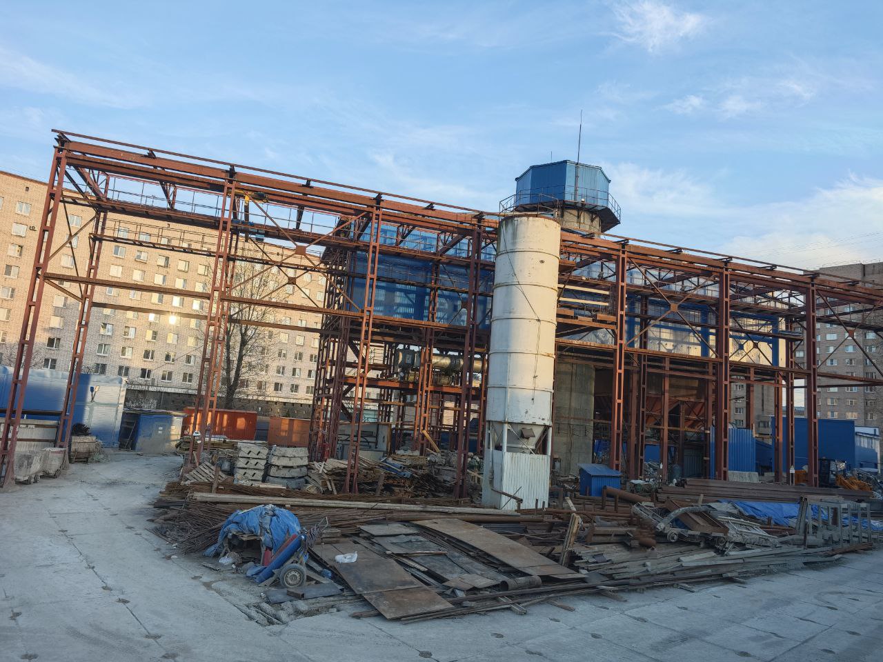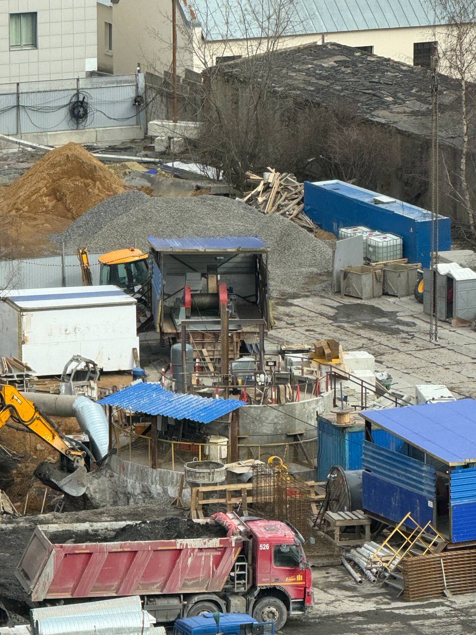 Помимо демонтажа горного комплекса, на строительной площадке идут работы по сооружению верхнего вентиляционного узла.
