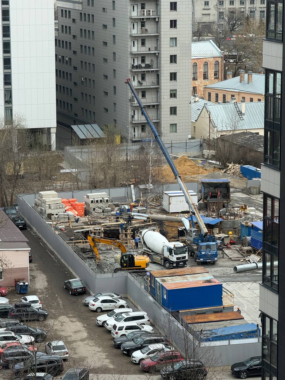 Строители продолжают устройство фундамента будущего здания комплекса. Неглубокий котлован на фотографиях - это он. Восточная часть фундамента уже готова, а остальную уже забетонировали.