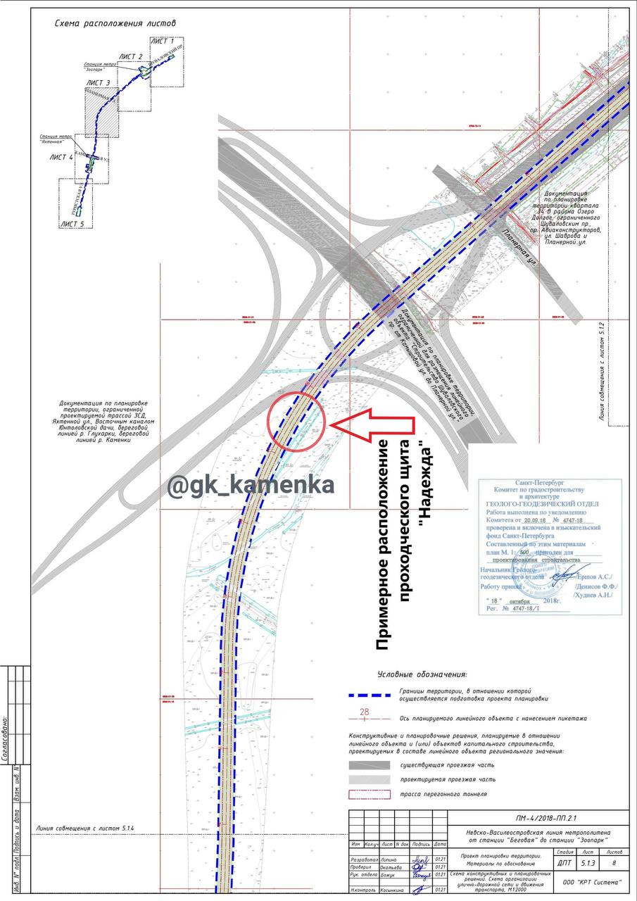 ТПМК «Надежда» приближается к пересечению Планерной улицы и Шуваловского проспекта. Об этом свидетельствует временное ограничение движения, введённое с 11 по 23 июня 2025 года на съезде с Шуваловского проспекта на ЗСД (южное направление). Помимо ограничения движения на съезде, были усилены его опоры, а также установлено оборудование для мониторинга как конструкций самого съезда, так и дневной поверхности.
