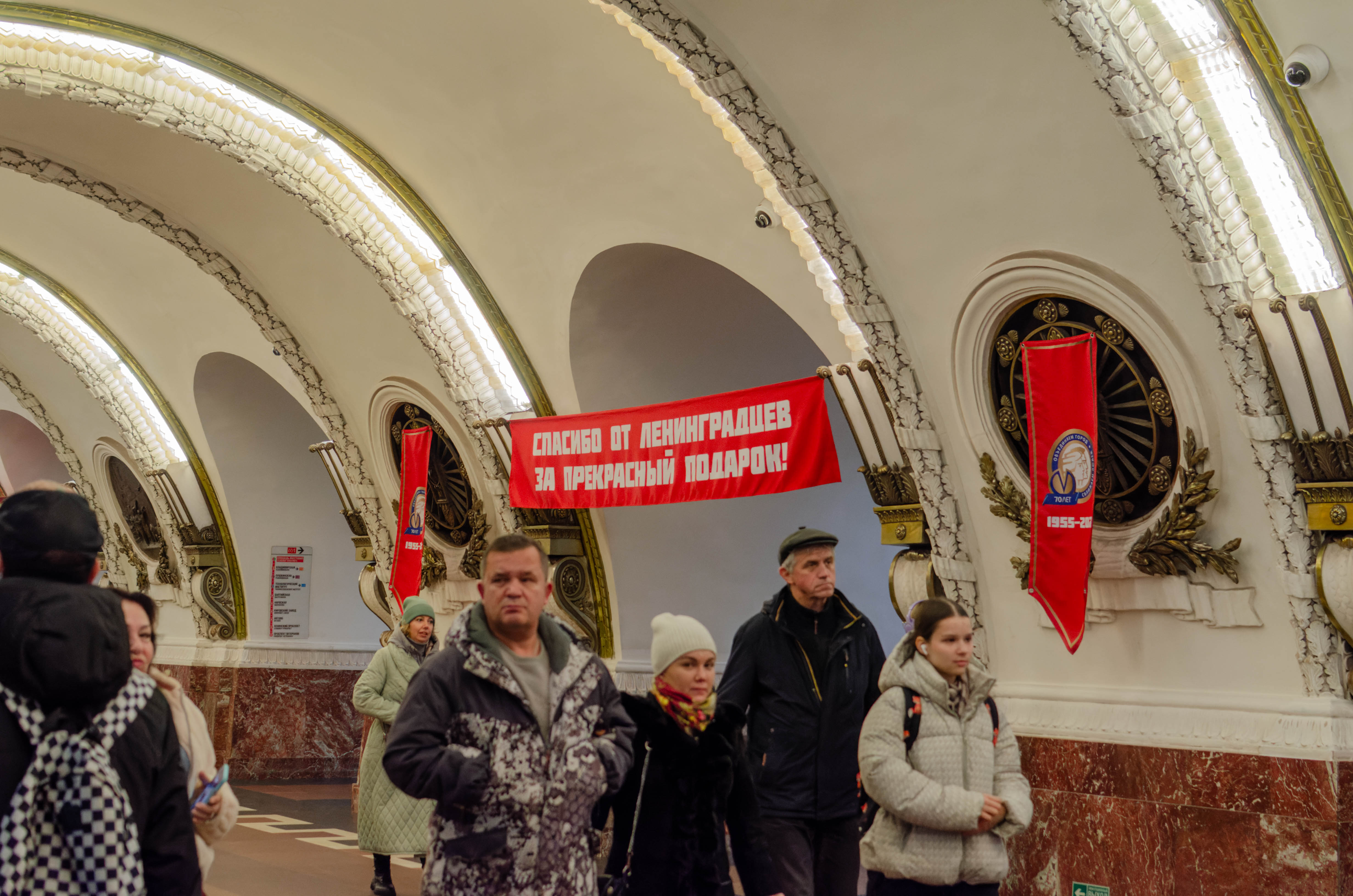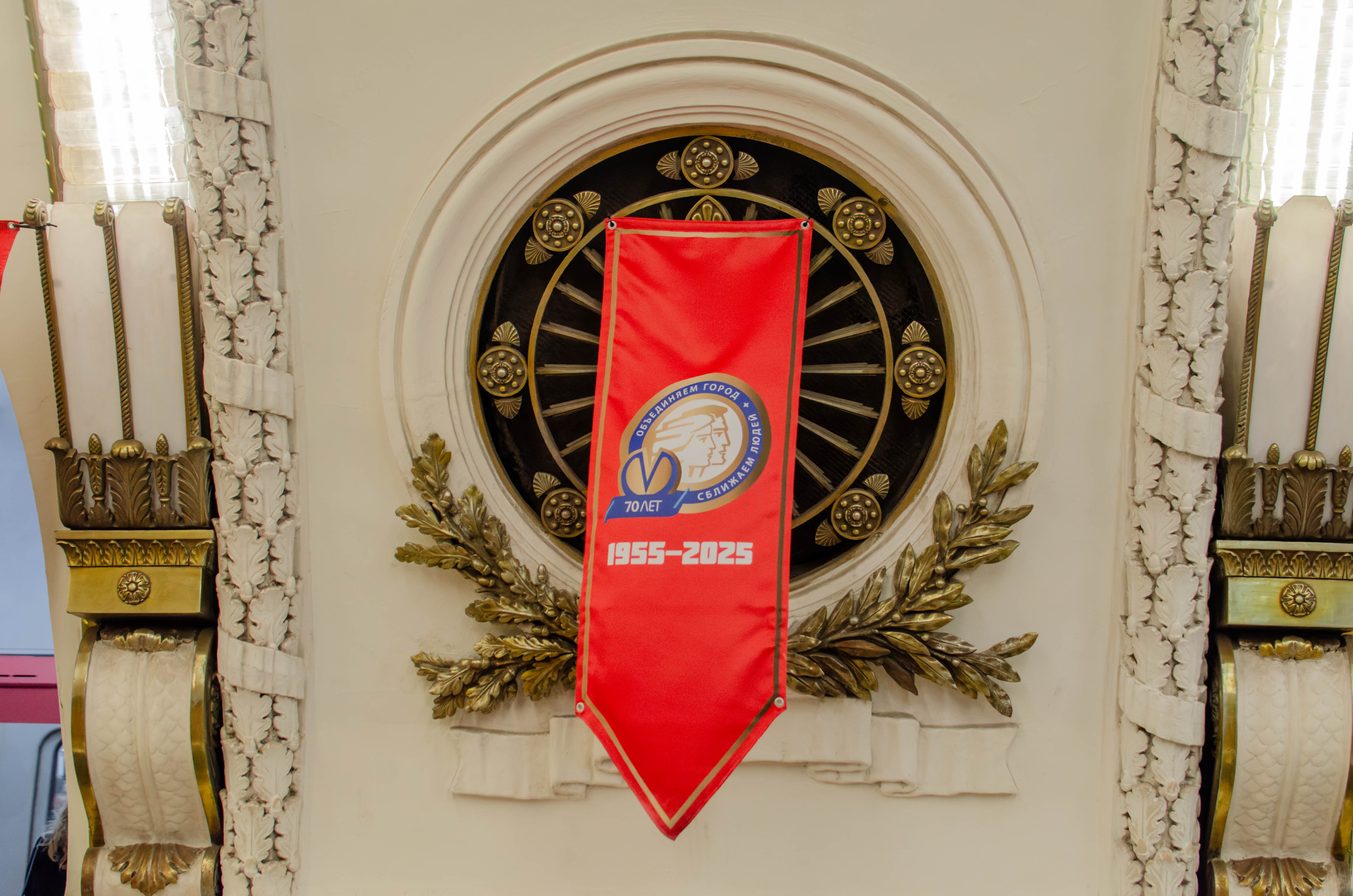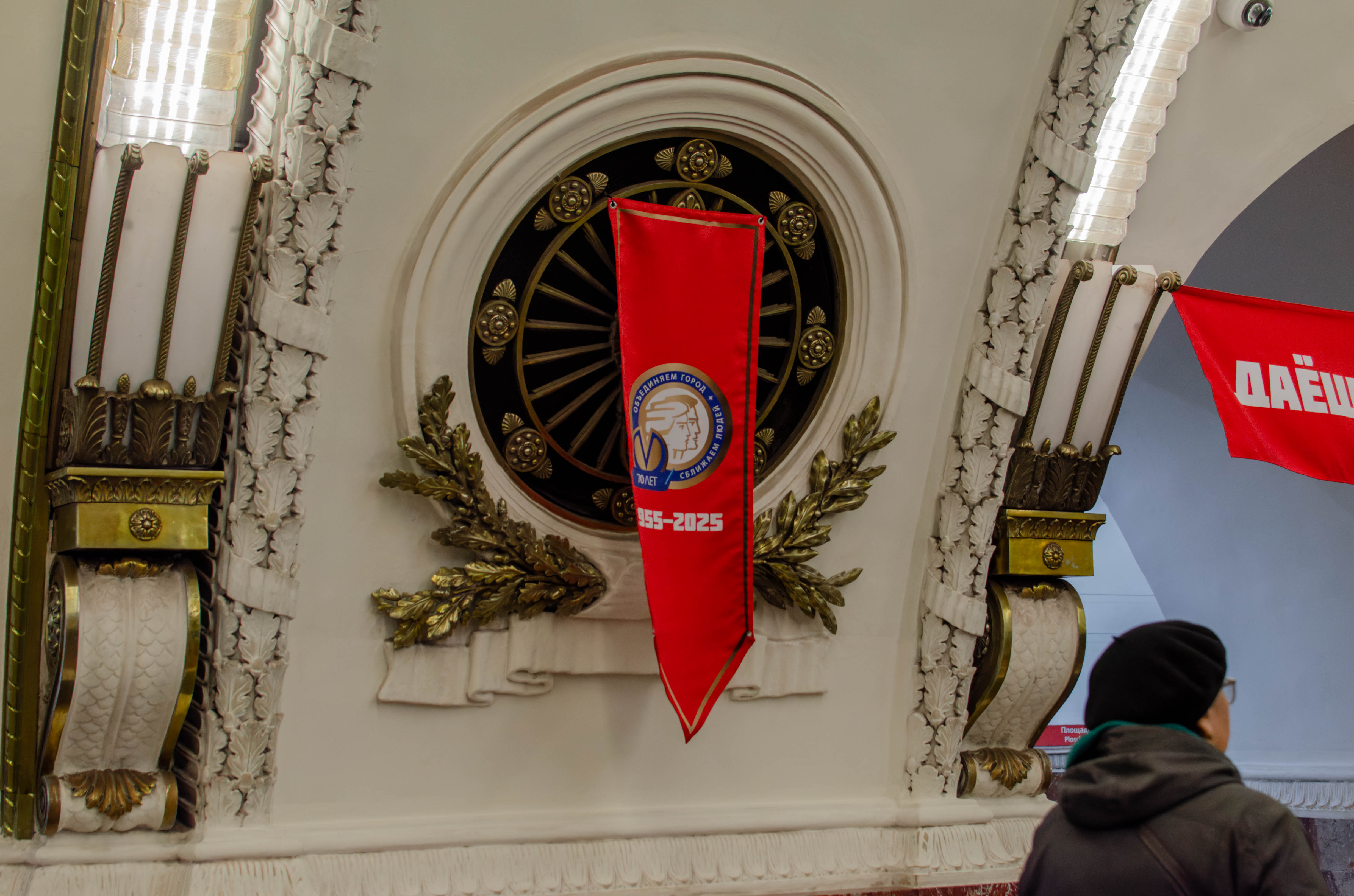 На станции вывешены транспаранты в связи с семидесятилетием метро. В духе "даешь первый поезд метро!".