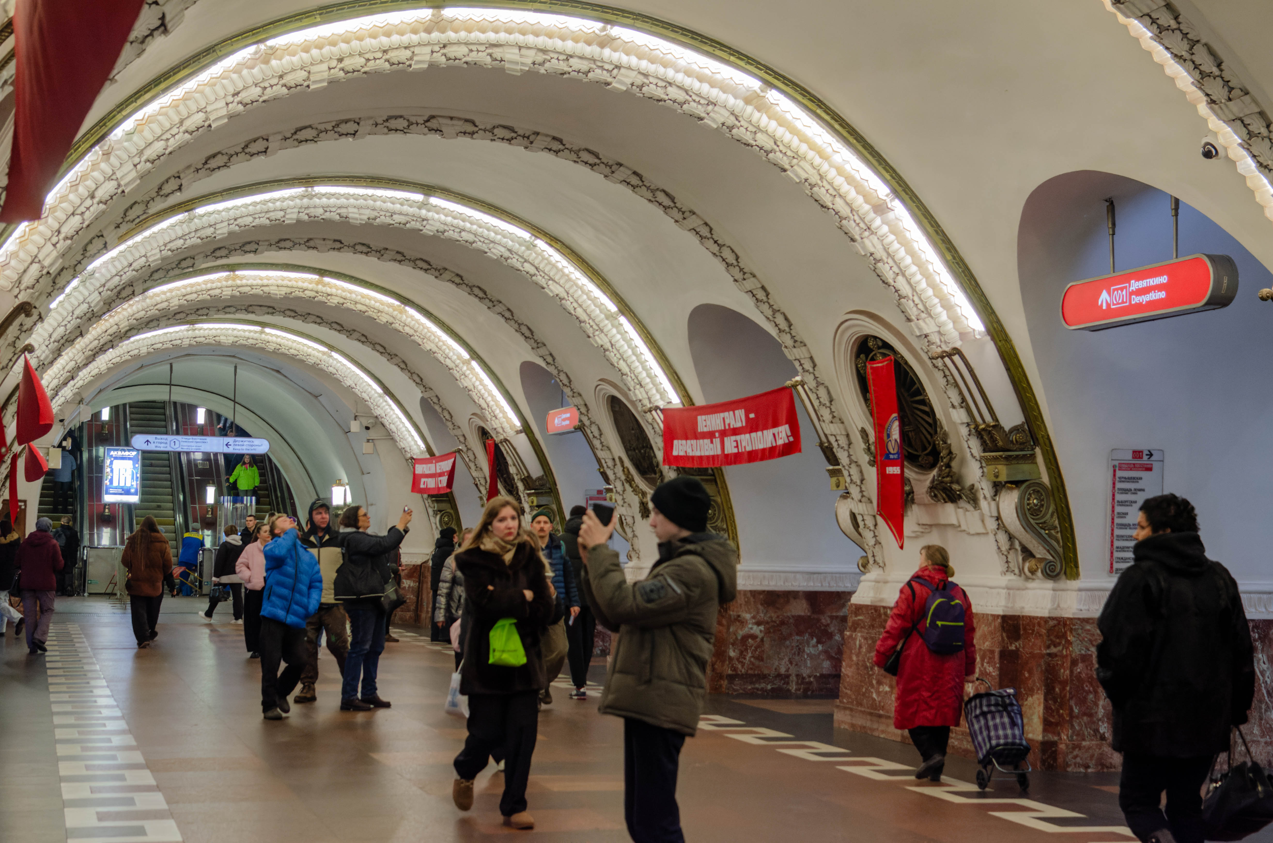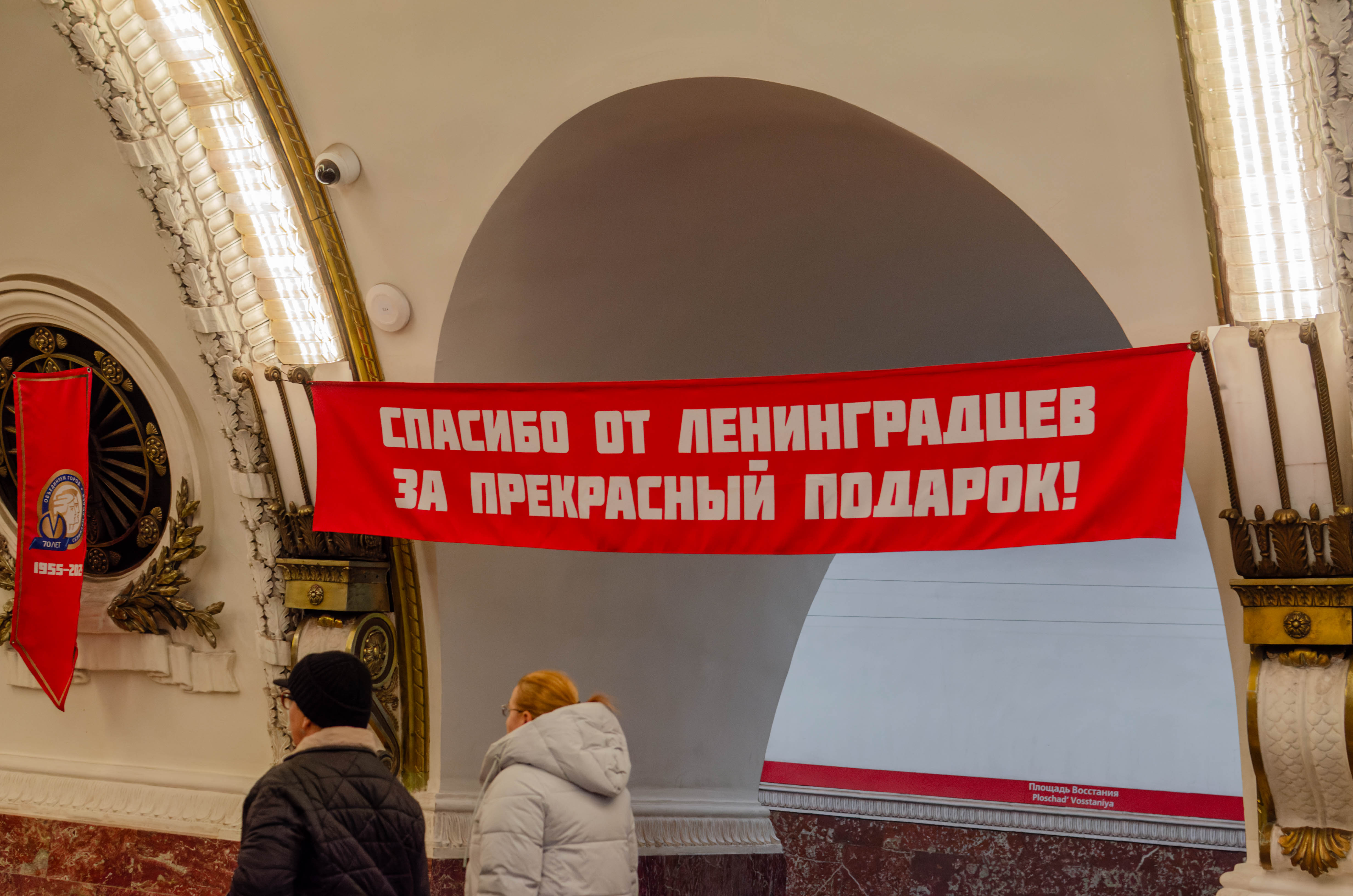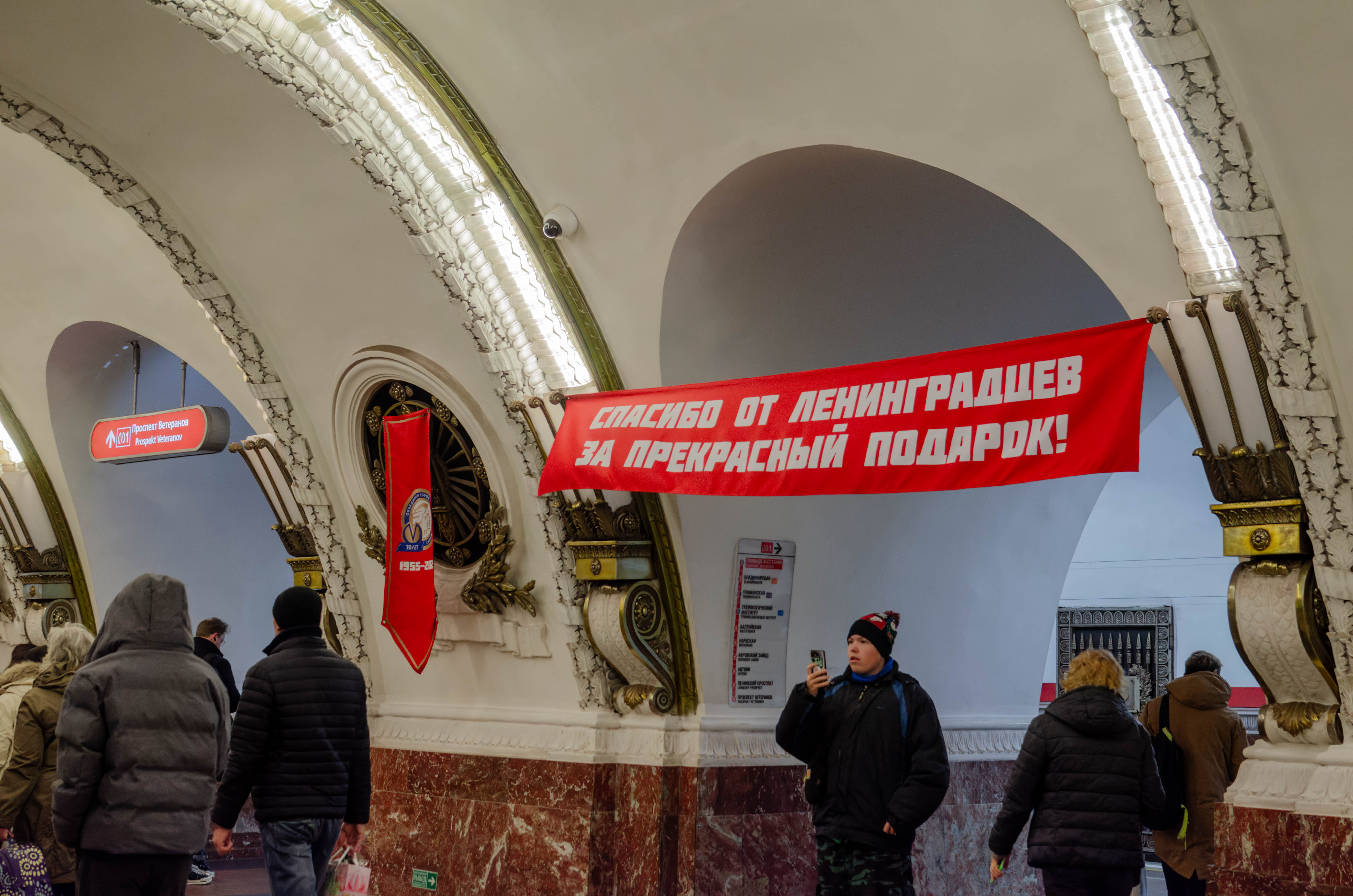 На станции вывешены транспаранты в связи с семидесятилетием метро. В духе "даешь первый поезд метро!".