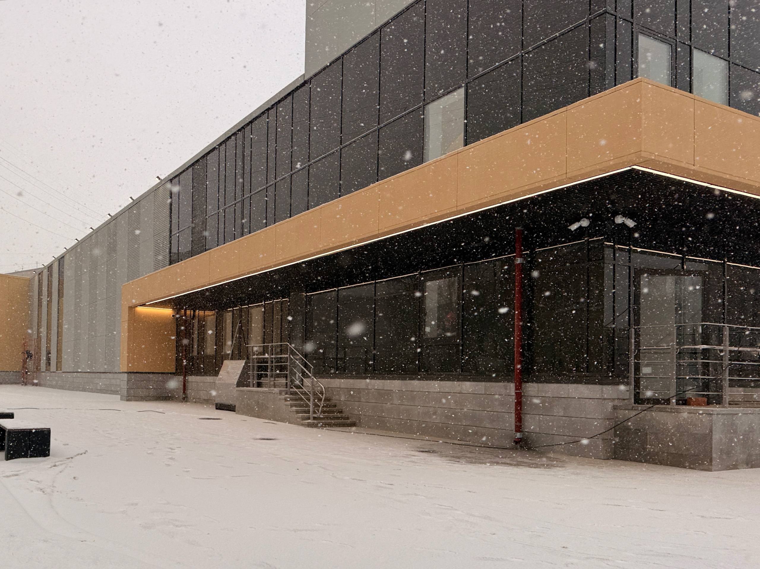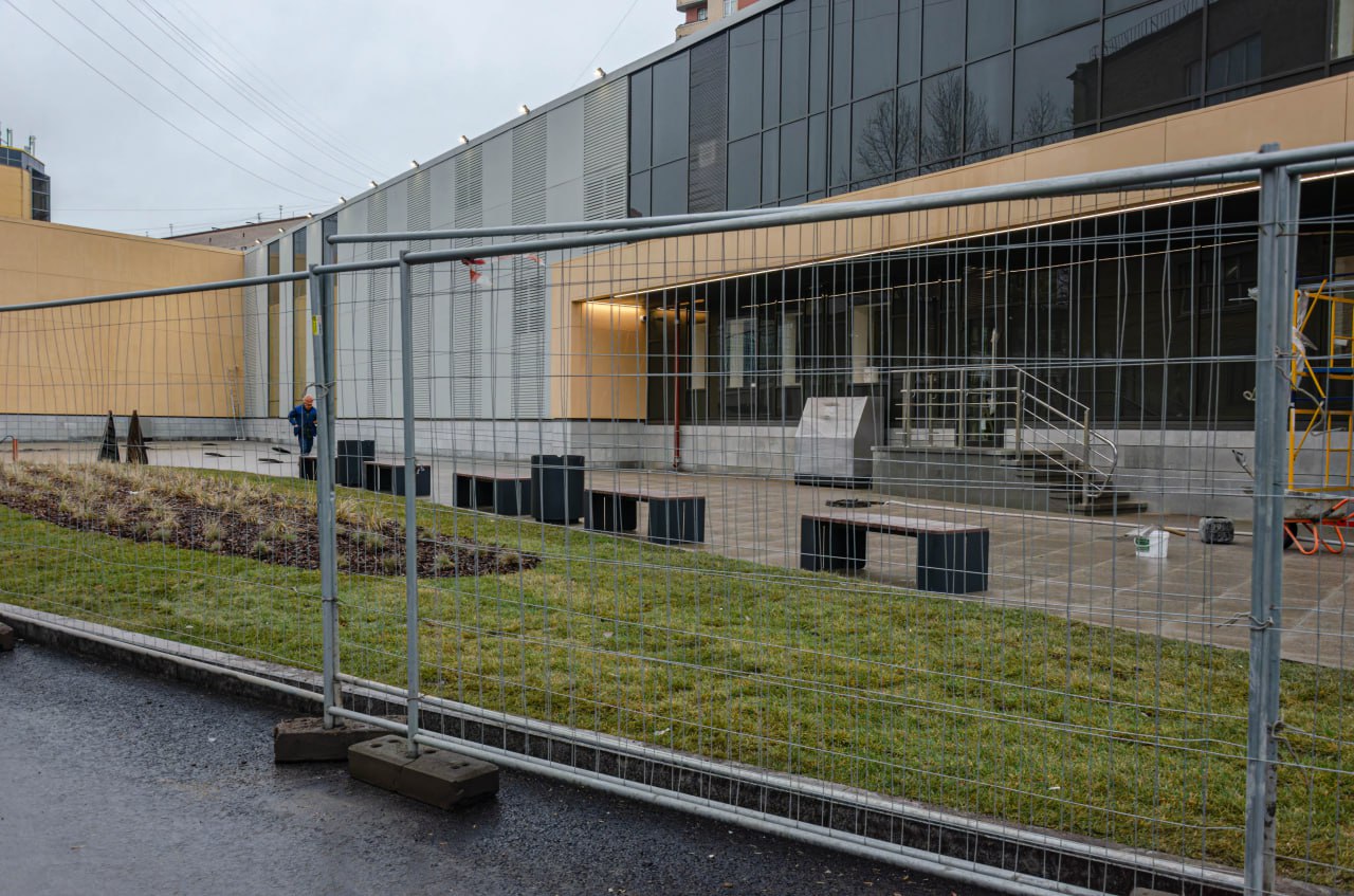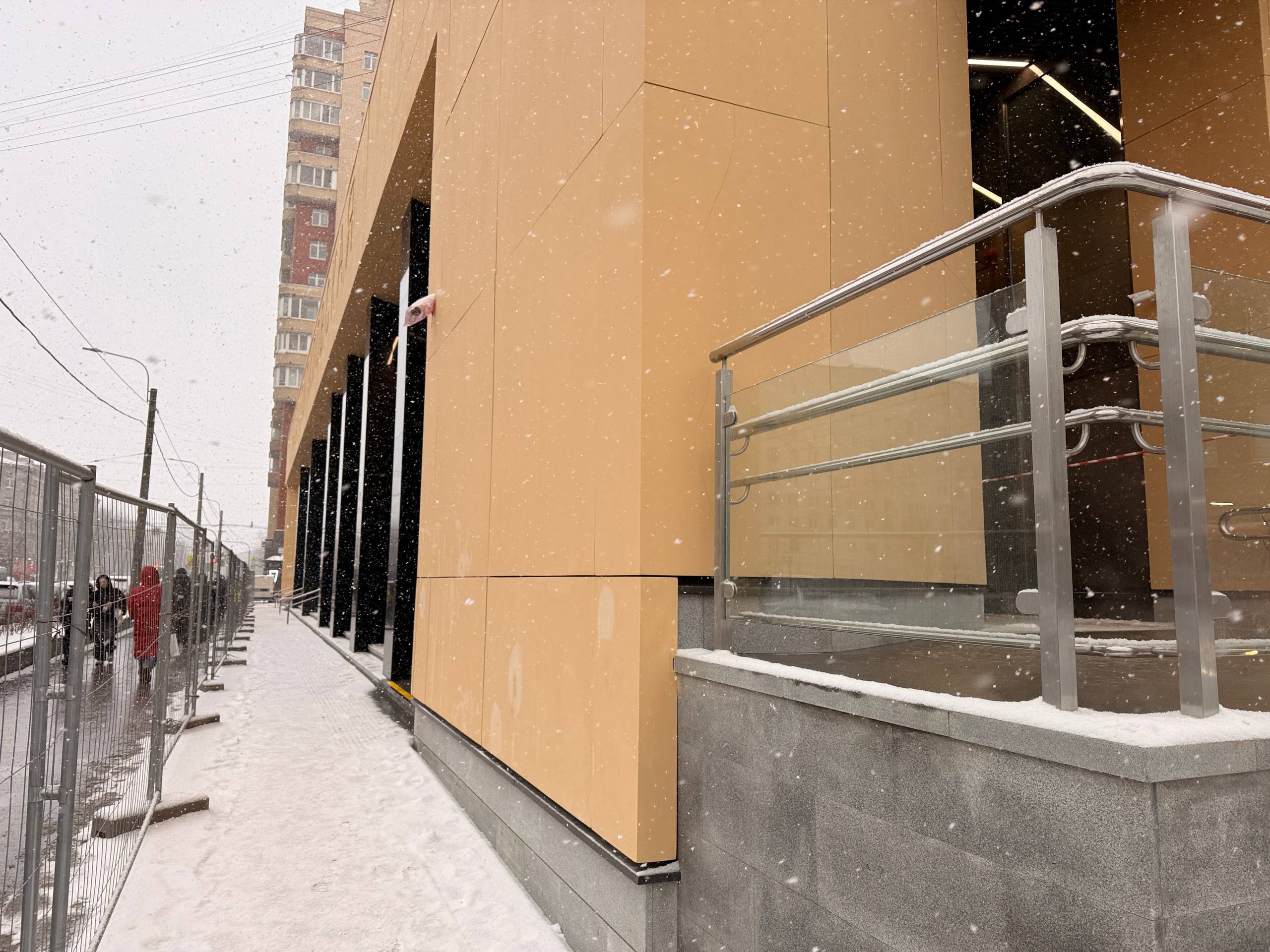 Со стороны входной группы, выходящей на улицу Васи Алексеева, завершена установка всех дверей входа и выхода из вестибюля, а также дверей коммерческих помещений.