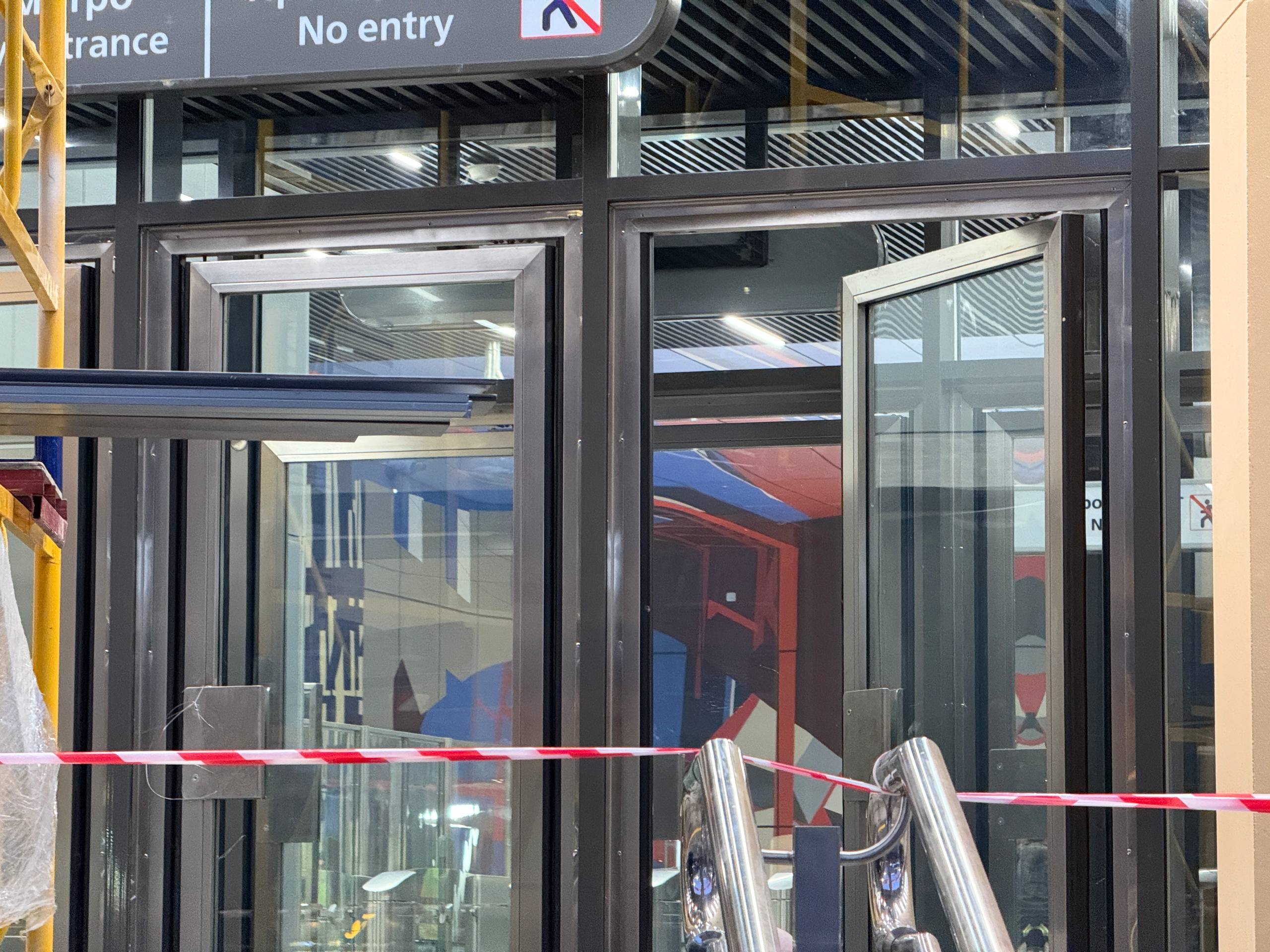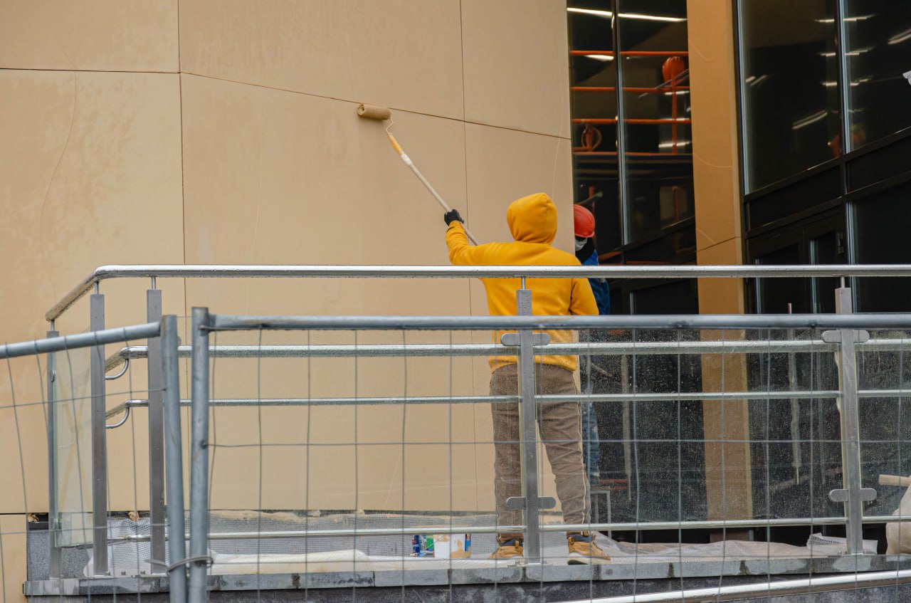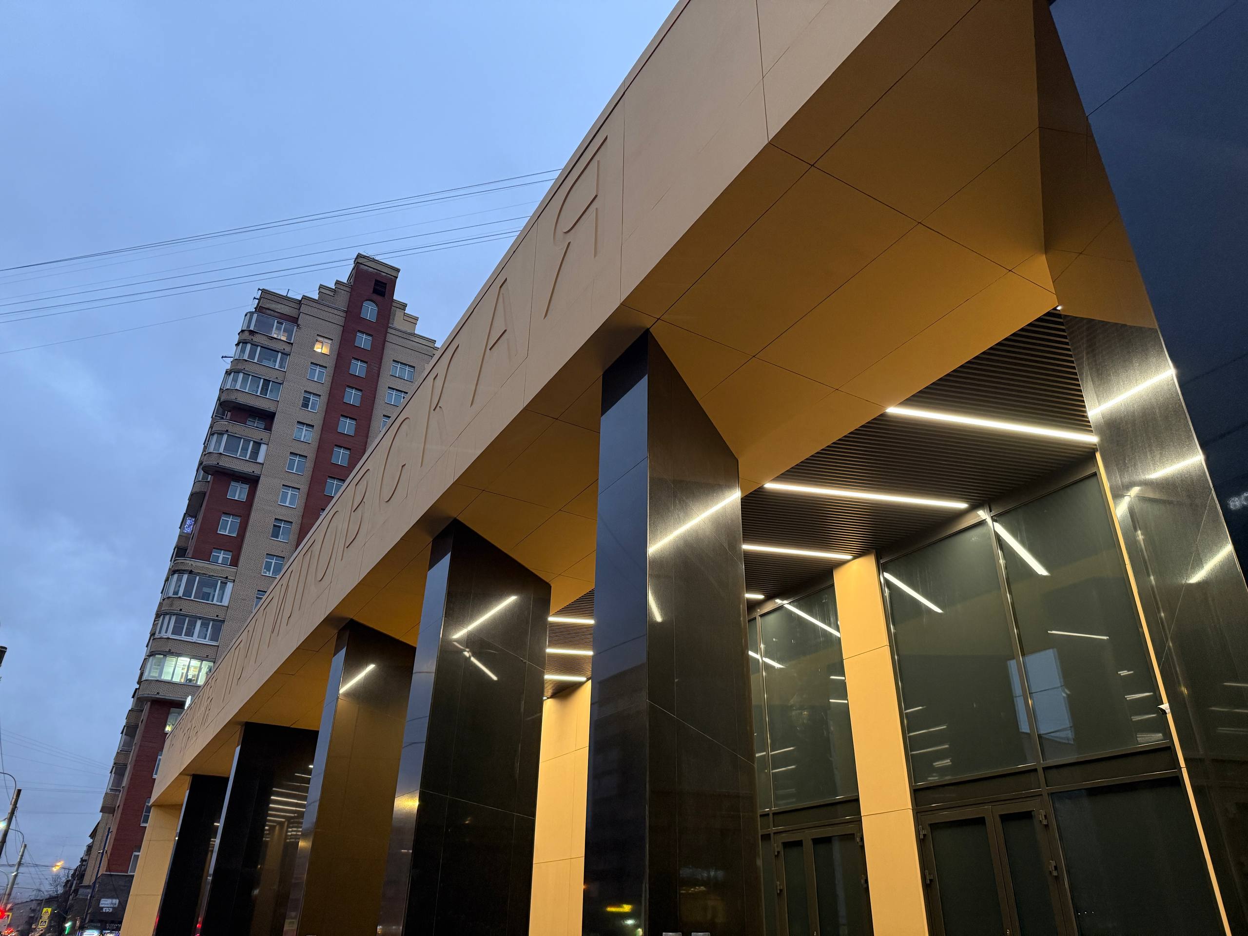 Со стороны входной группы, выходящей на улицу Васи Алексеева, завершена установка всех дверей входа и выхода из вестибюля, а также дверей коммерческих помещений.