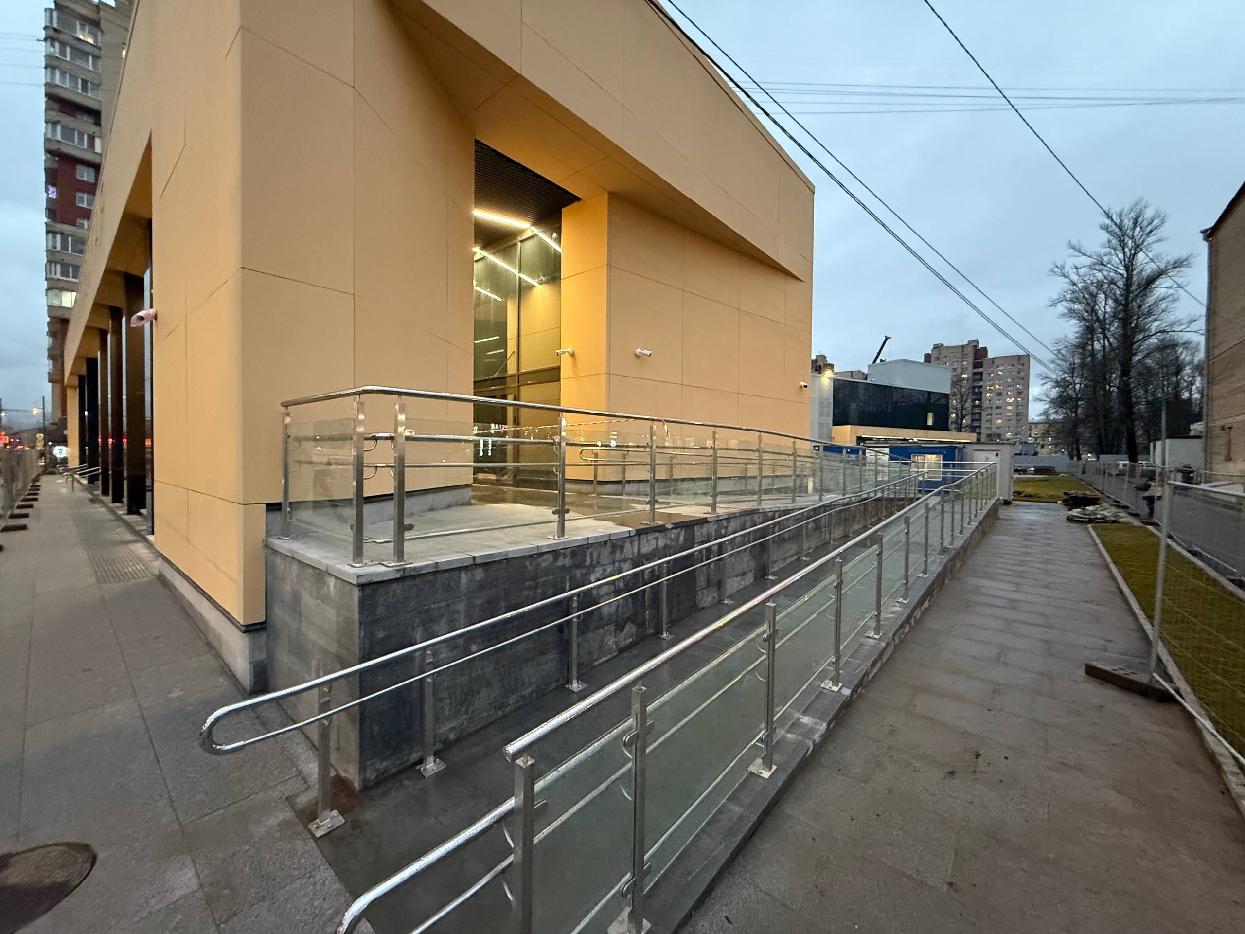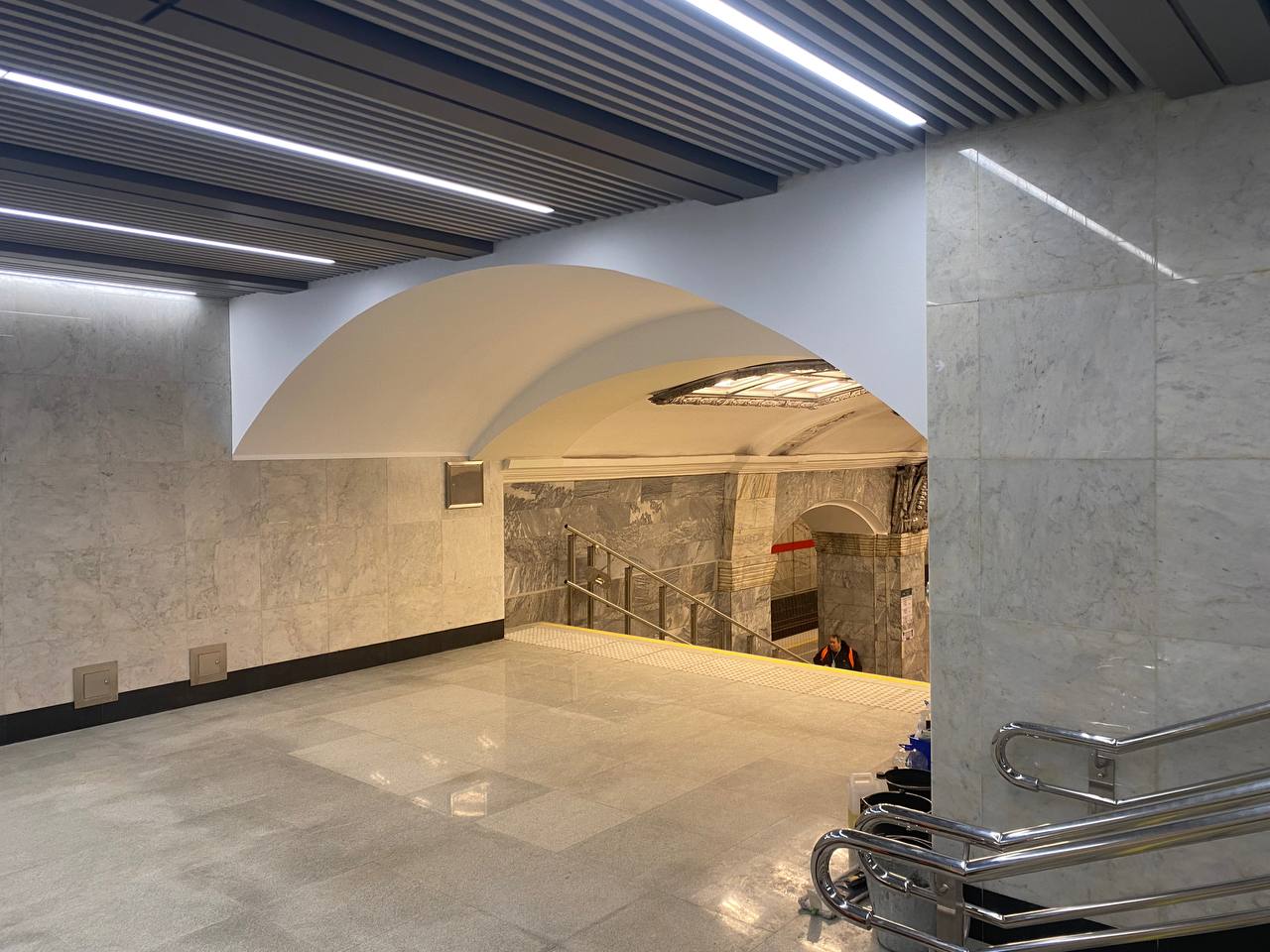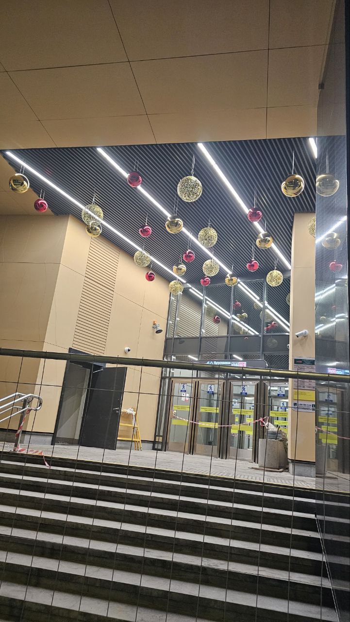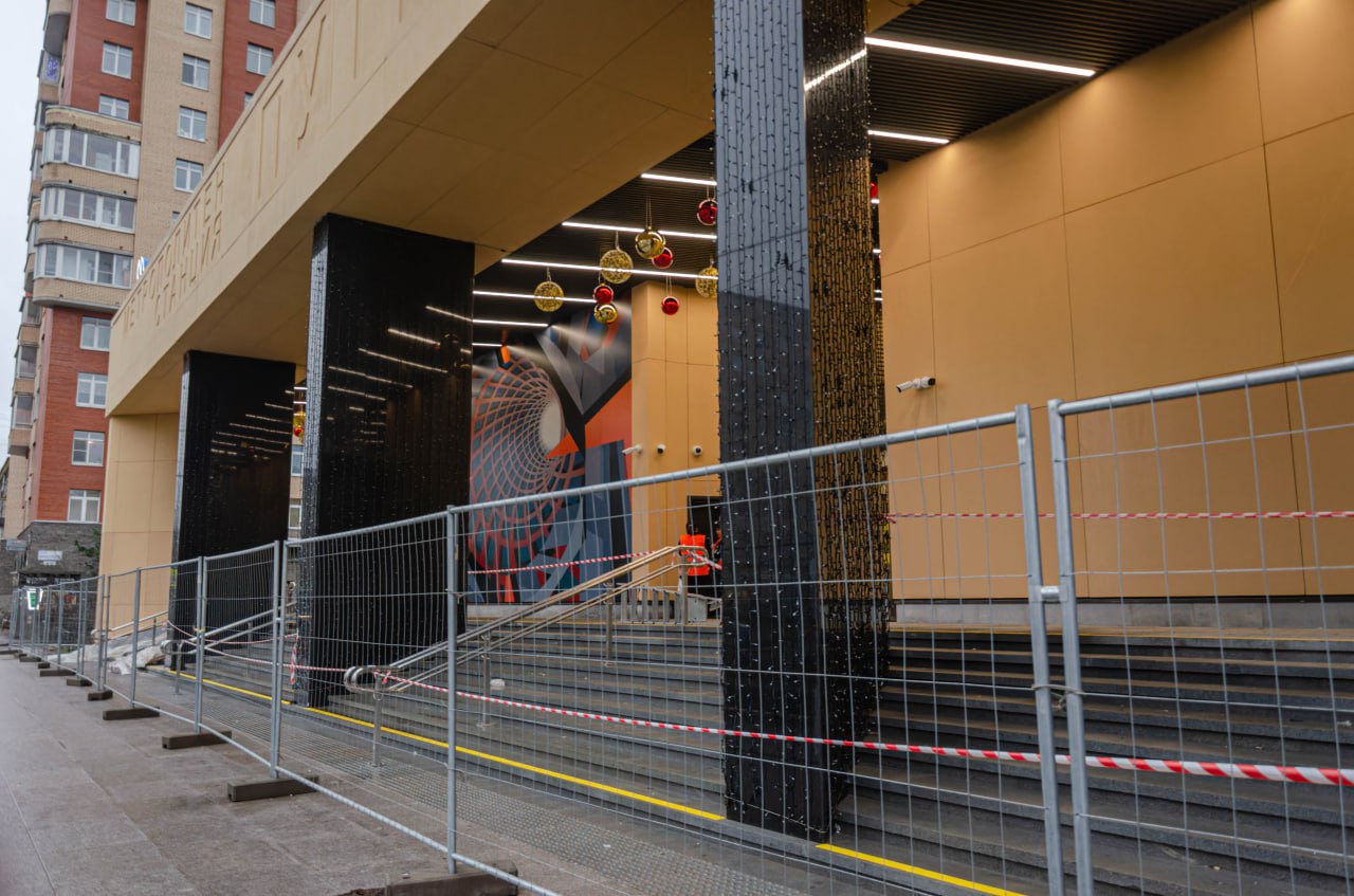Завершена облицовка вестибюля панелями из фибробетона и смонтировано декоративное панно. Завершена облицовка ступеней, пола и пандуса для маломобильных пассажиров гранитными плитами. Установлены поручни на лестнице перед входом и выходом, а также перила ограждения пандуса.