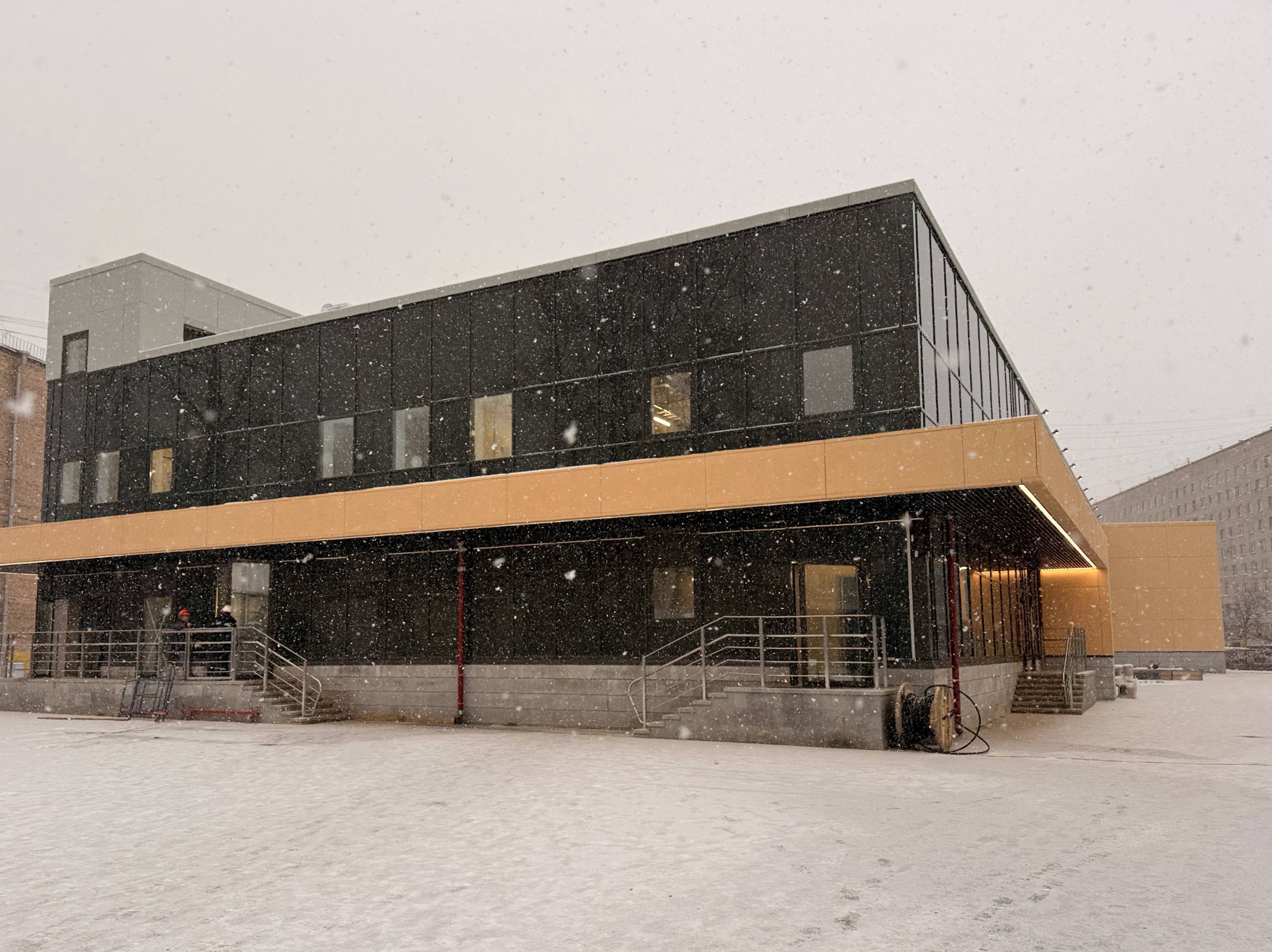 Со стороны внутреннего двора завершена установка фасадных плит на козырьке служебной части вестибюля, а также реечного потолка (куботы) и светильников.