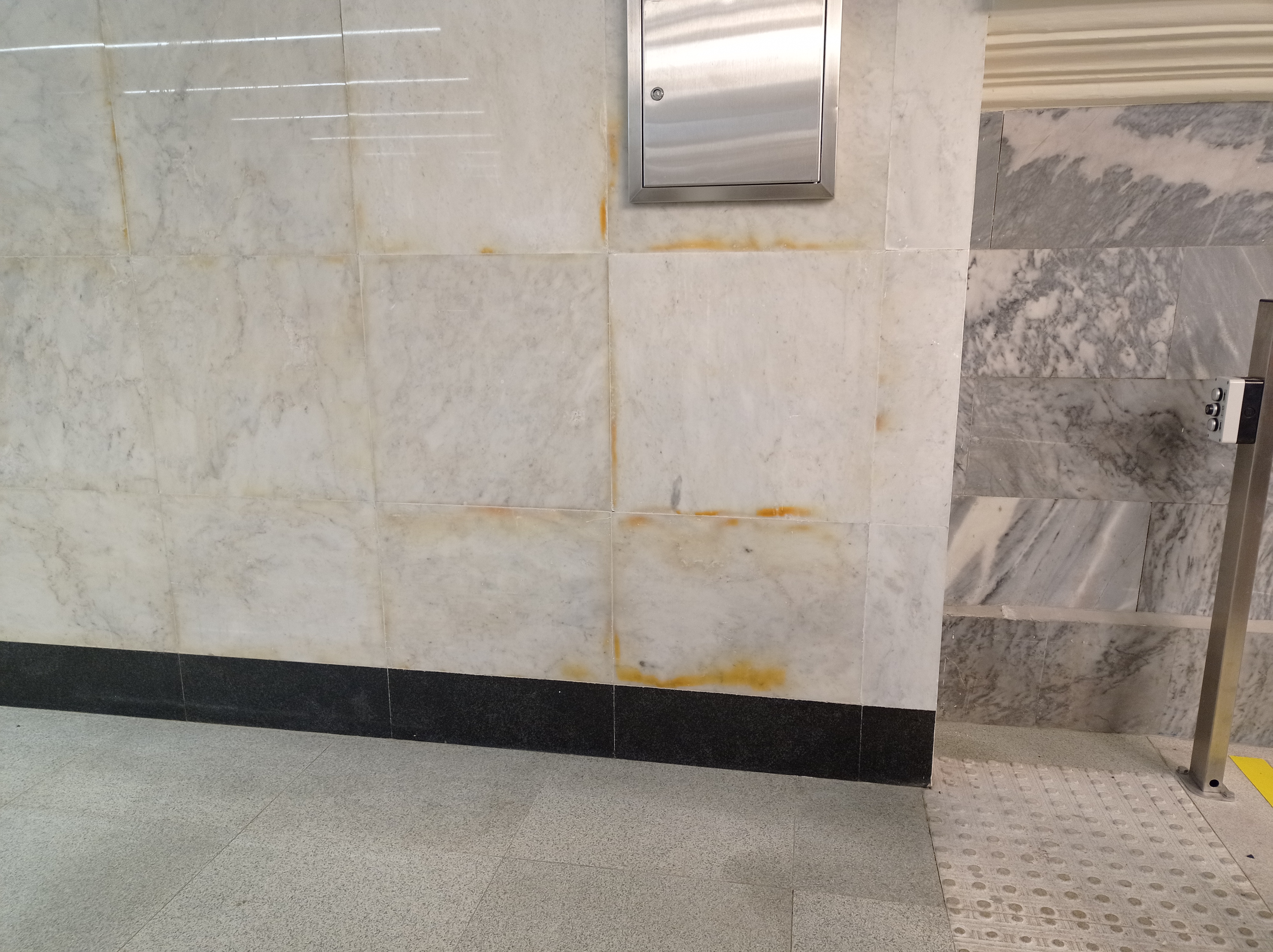 Может кто-нибудь сказать, что это за жёлтые разводы вокруг стыков между мраморными плитами? Причем эти разводы усеяны по всему коридору до МНХ.