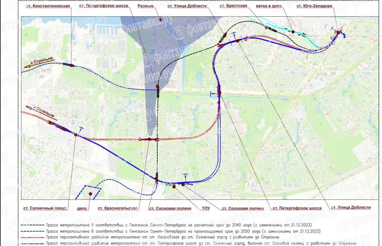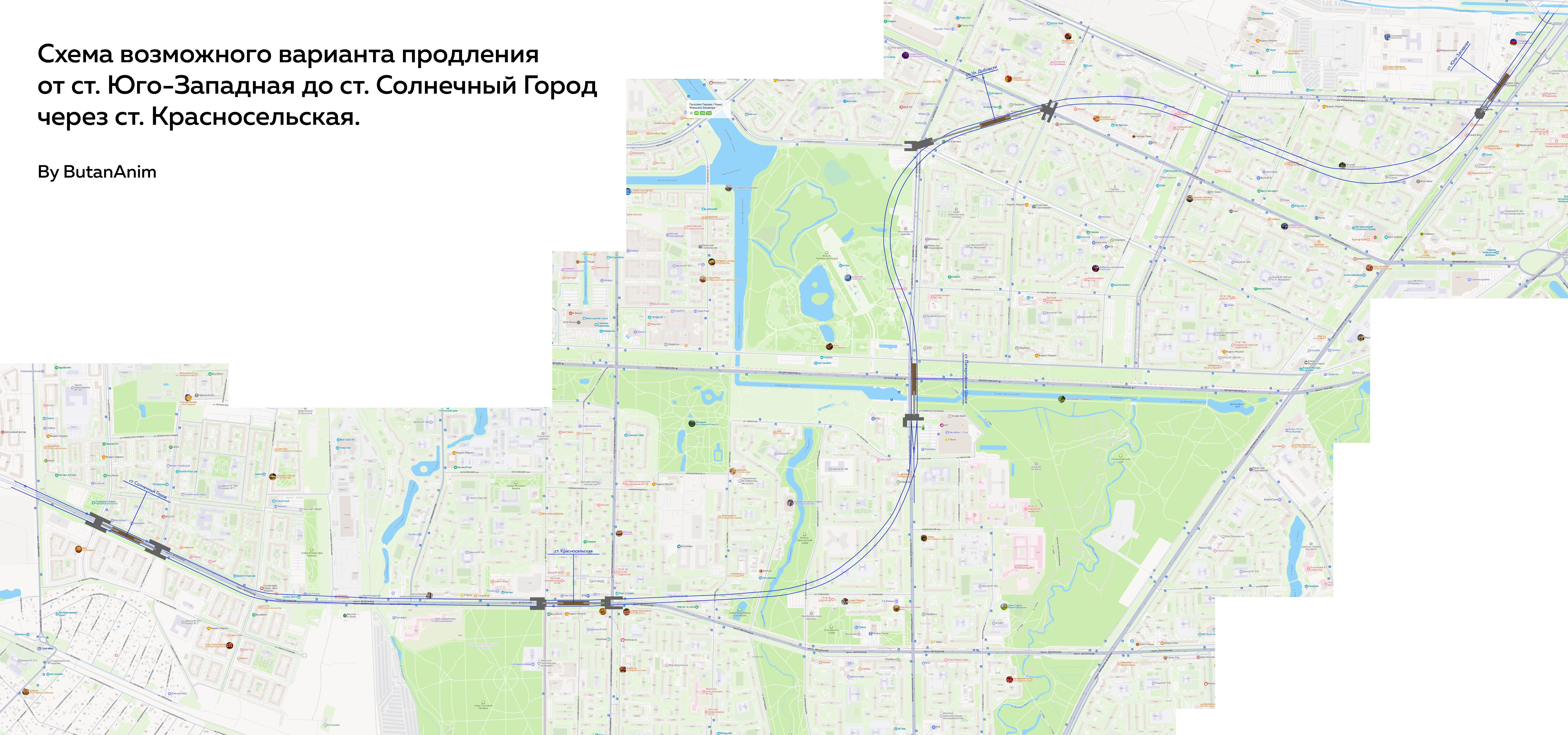 Вчера нарисовал схемку продления до Солнечного города через Красносельскую, на счёт выходов на Петергофском шоссе я почти не понял, что там калякать.