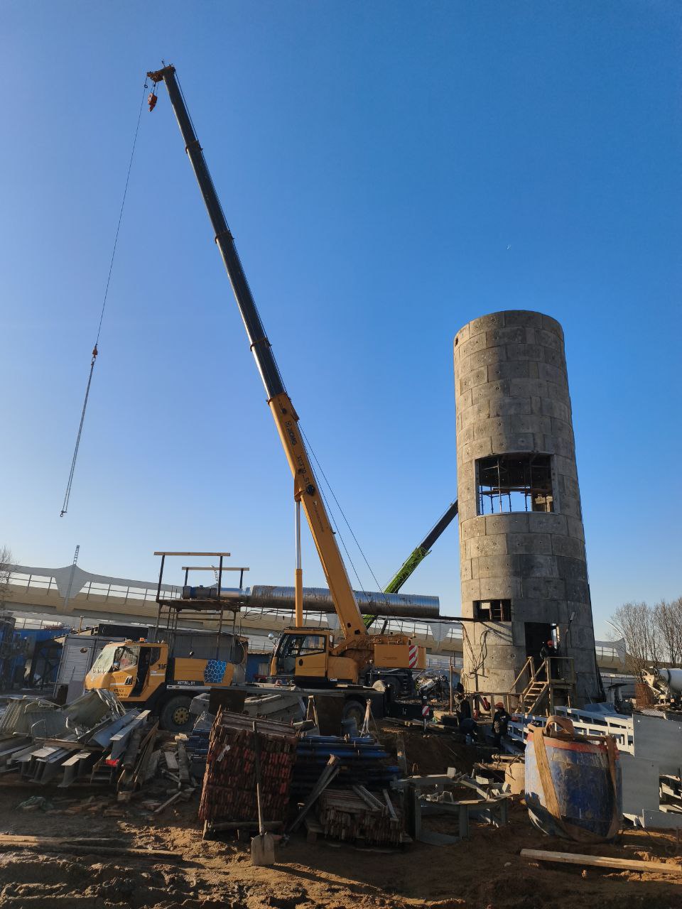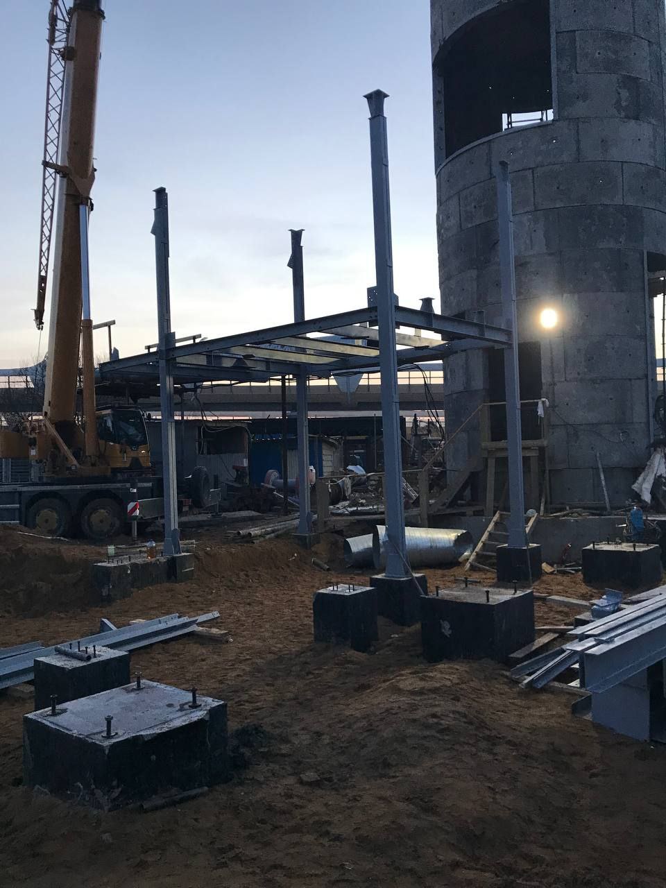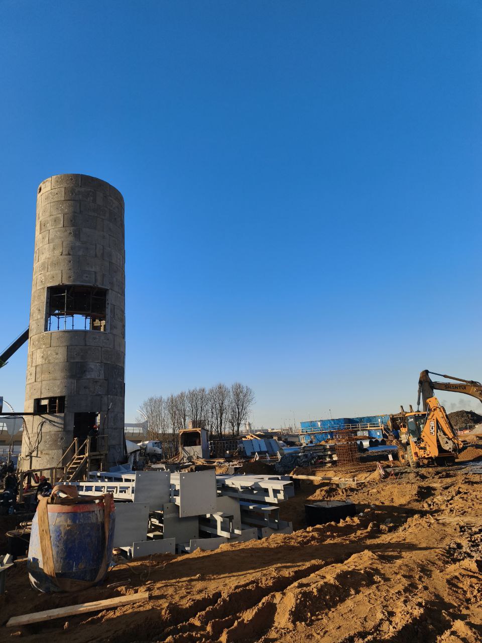 Полным ходом идёт оборудование горного комплекса. Установлены все несущие опоры и горизонтальные балки перекрытий, подвешены 4 бункера-накопителя для грунта. Ведётся наладка подъёмной машины.
