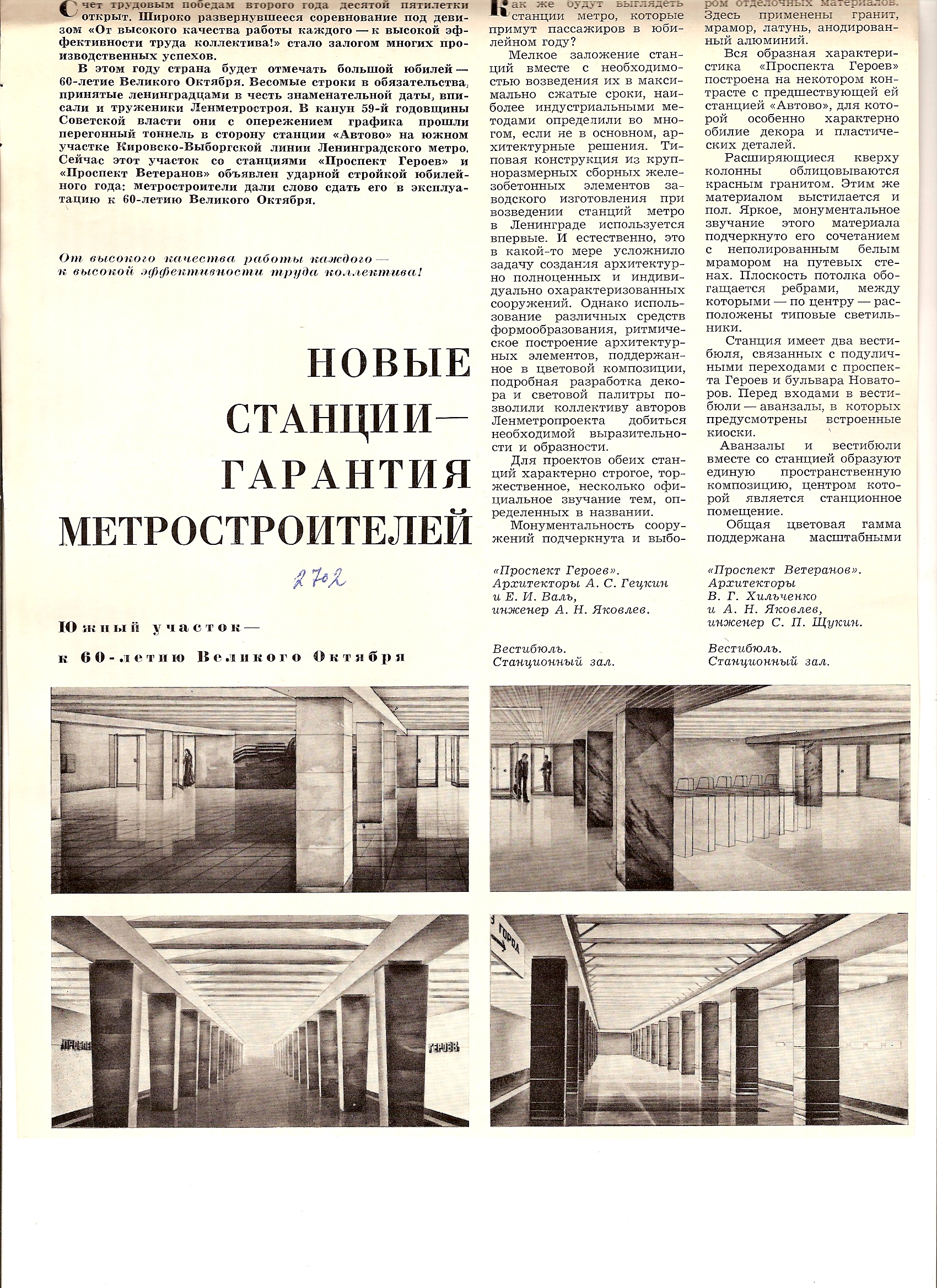 Вырезка из журнала "Строительство и архитектура Ленинграда" о строительстве перегонов и станций. Станция "Ленинский проспект" называется в статье "Проспект Героев" (так называлась часть проспекта от Балтийского направления ж/д до ул. Зины Портновой до 18 апреля 1977 года).