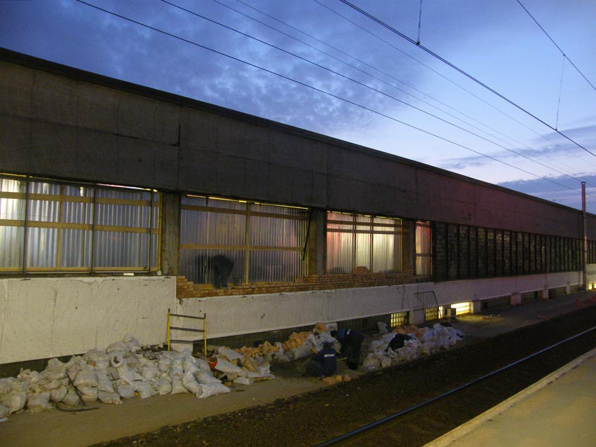 А тем временем начали ремонтировать фасад, выходяший на платформу ж/д: демонтируются стеклоблоки, на стенах делают "насечки" для лучшего последуюшего сцепления штукатурки или каких-либо облицовочных материалов, сверху уже закрепляют штукатурную сетку. Несколько фотографий: