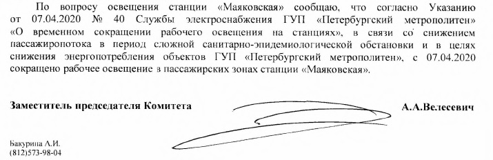Специалисты ГУП "Петербургский метрополитен" прекрасно знают нормы освещенности согласно "Санитарным правилам эксплуатации метрополитенов"! Освещение сокращено только там где это безопасно для нас - пассажиров.
