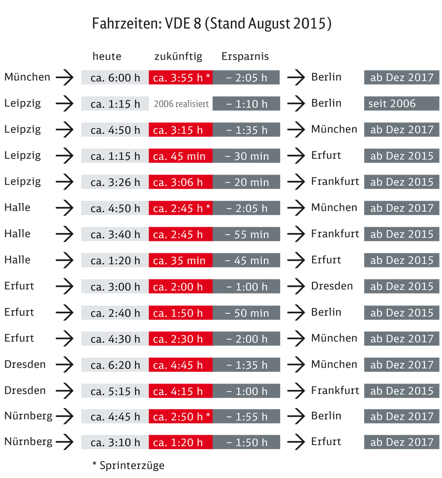 В связи с этим железнодорожный узел Эрфурта закрывался на одни из выходных ноября, но уже с 13 декабря этого года поезда из Эрфурта в Берлин будут приходить на 50 минут быстрее (1ч50 вместо 2ч40), а из Эрфурта в Дрезден - на час быстрее - 2 часа вместо 3.
