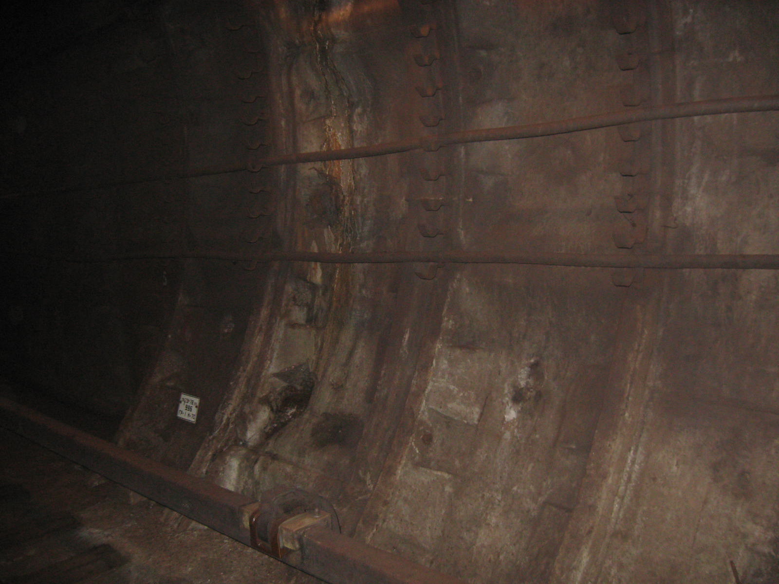 Кроме того, можно однозначно сказать, что кольца обжатой обделки, примыкающие к границе венткамеры с кроссингом, были перебраны на ребристую обделку уже после проходки, т.к. ребристая обделка имеет меньший наружный диаметр кольца - 5.5м и замок кольца находится в своде.
