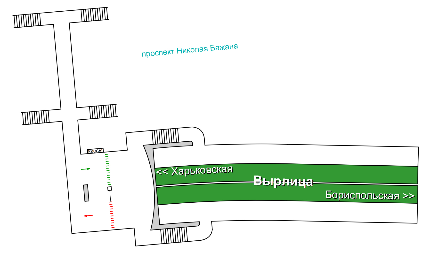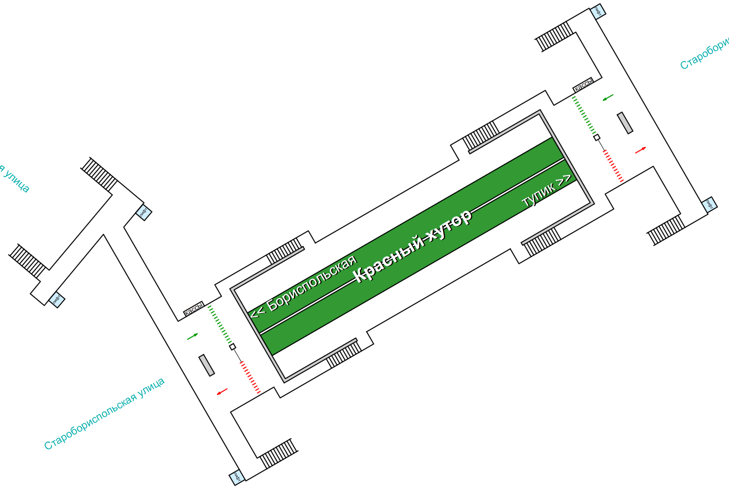 Справедливости ради дополню Костю. Не упомянута еще одна станция Киевского метрополитена - "Красный хутор" (укр. «Червоний хутір»), открытая в 2008 году. Схемой, к сожалению, не располагаю, приведу иллюстрацию с расположением вестибюля. Прошу прощения за оффтоп.