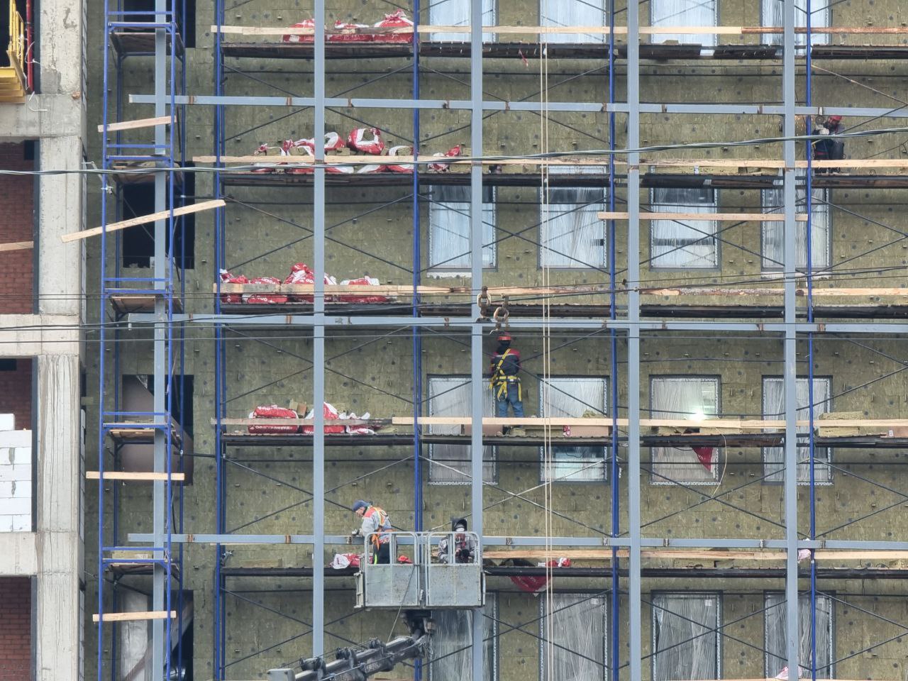 На данный момент, на 5 из 6 сторон здания ведутся фасадные работы.
