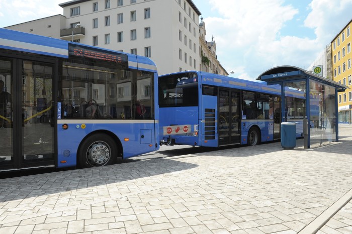 В статье сказано про автобусы с прицепом, которые испытывались в Мюнхене. Давайте посмотрим на него. В интернете я нашёл два автобуса: SOLARIS и уже известный Goppel (см. на фото ниже).