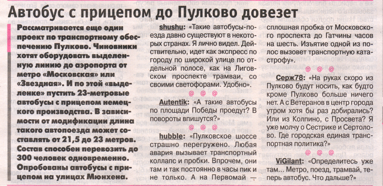 В газете "Петербургский дневник" за 20 июня 2014 г. содержится эпичный лулз про выделенный автобус в Пулково, да ещё и с прицепом (!!!)...