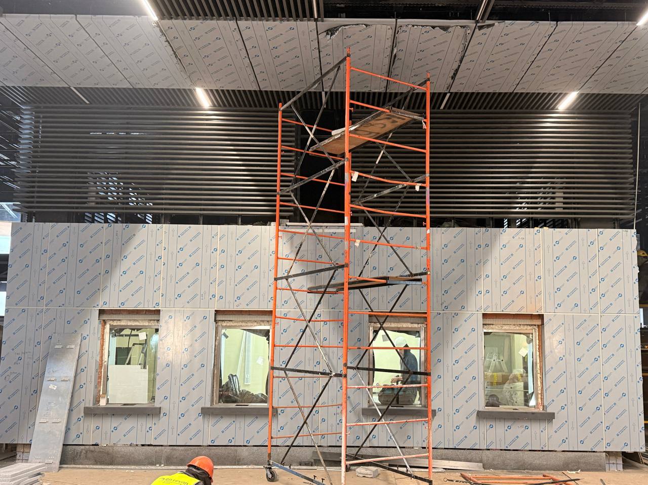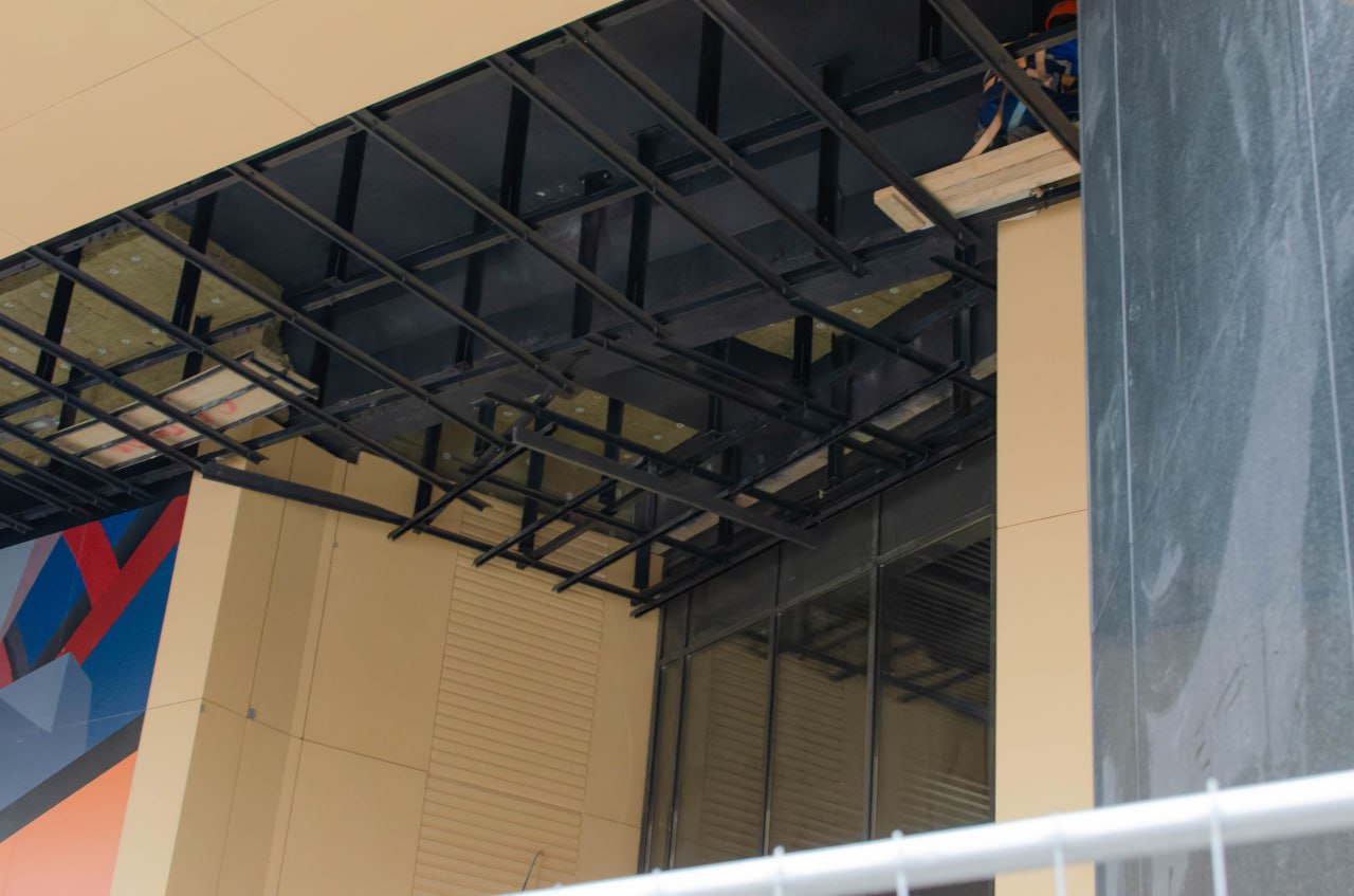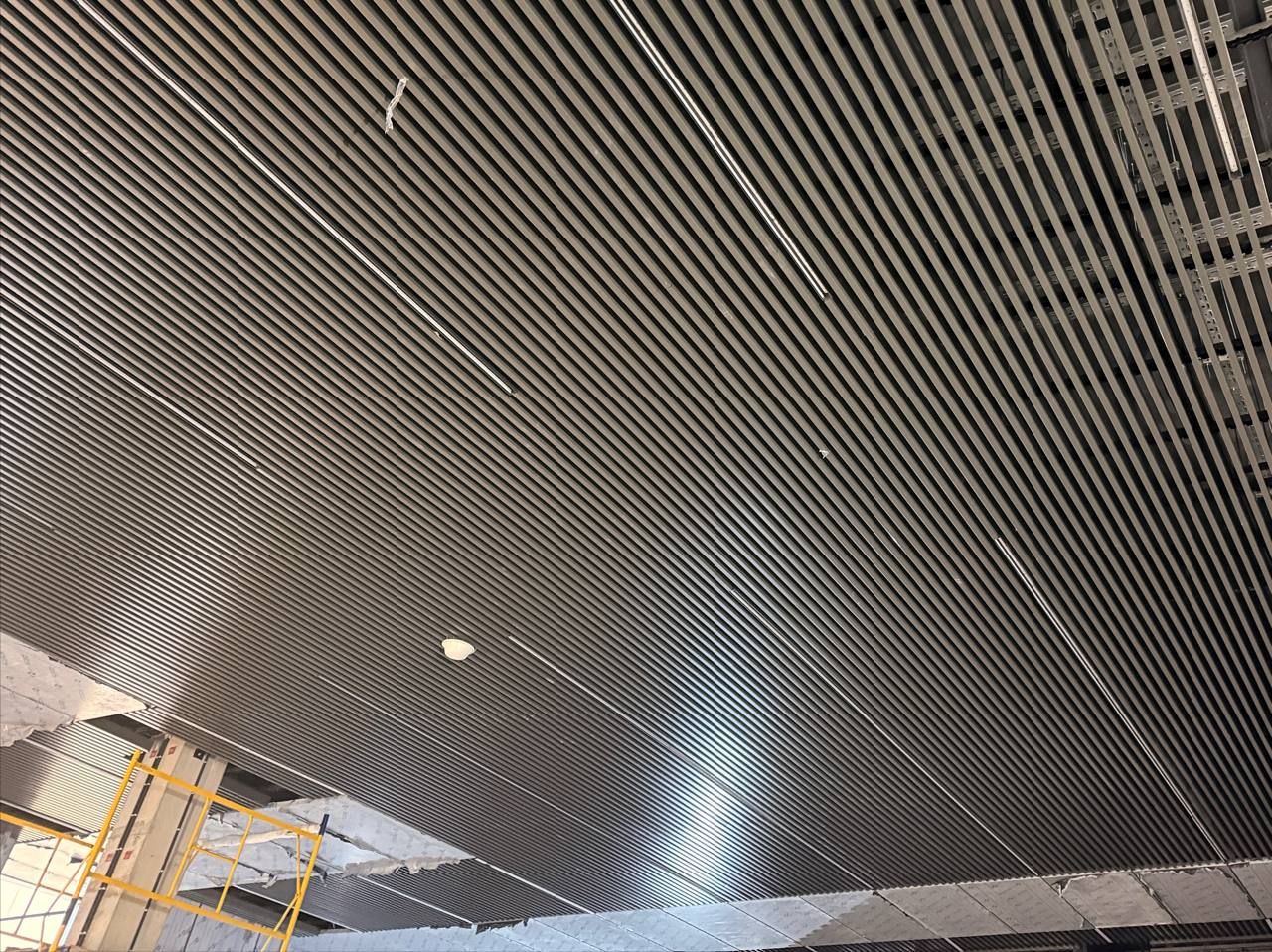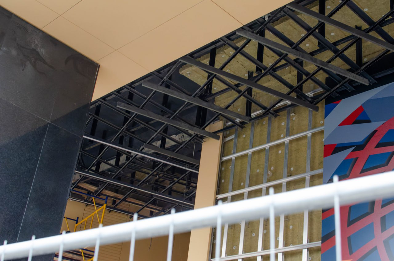 Завершается монтаж серых алюминиевых сотовых панелей на стены зала. Также завершена установка подсистемы и продолжается монтаж подвесного потолка из реек кубической формы (так называемого «кубота»).