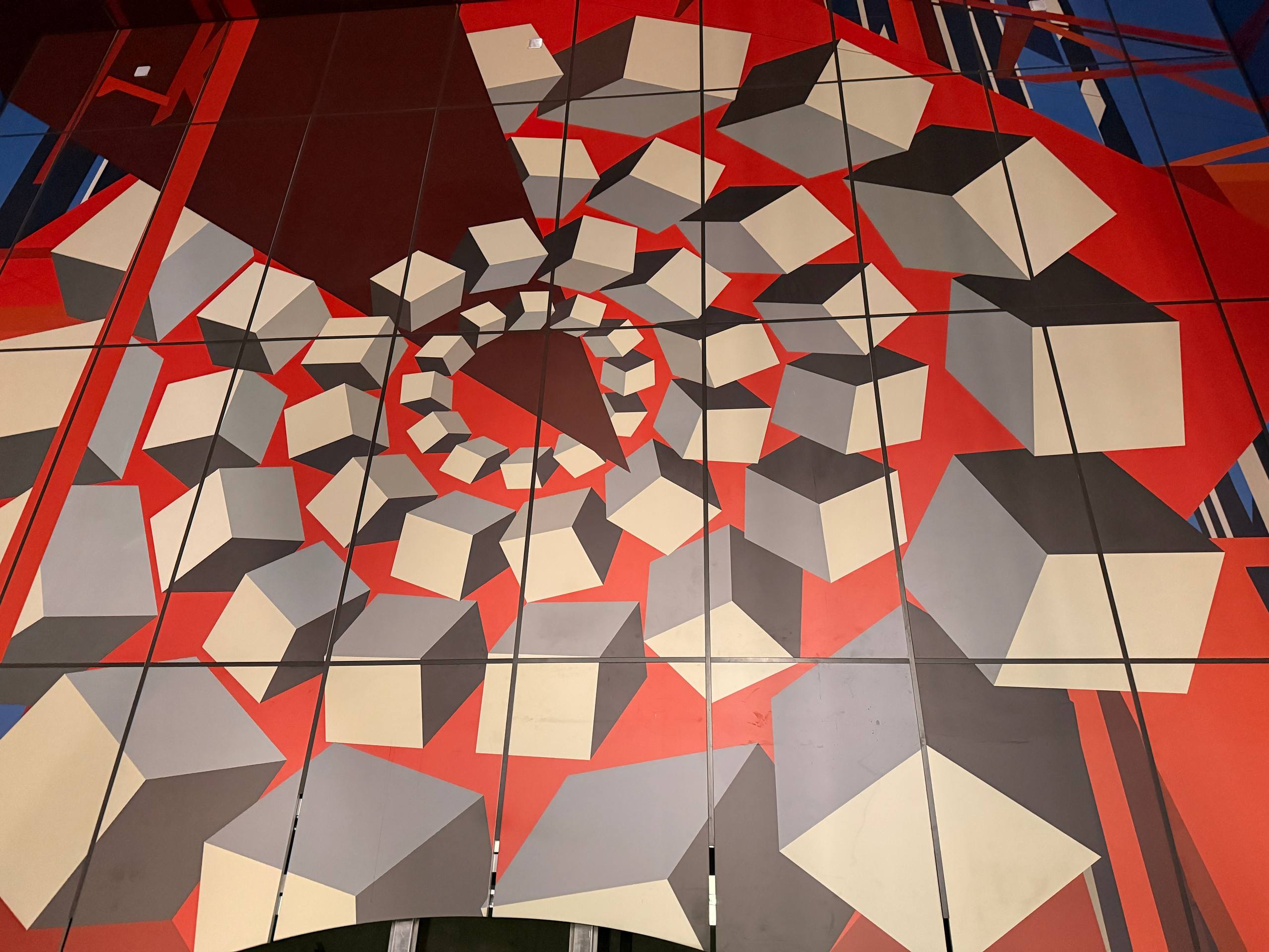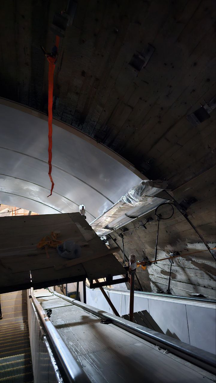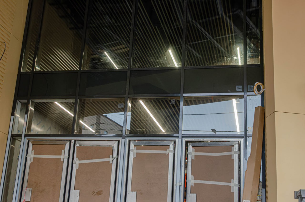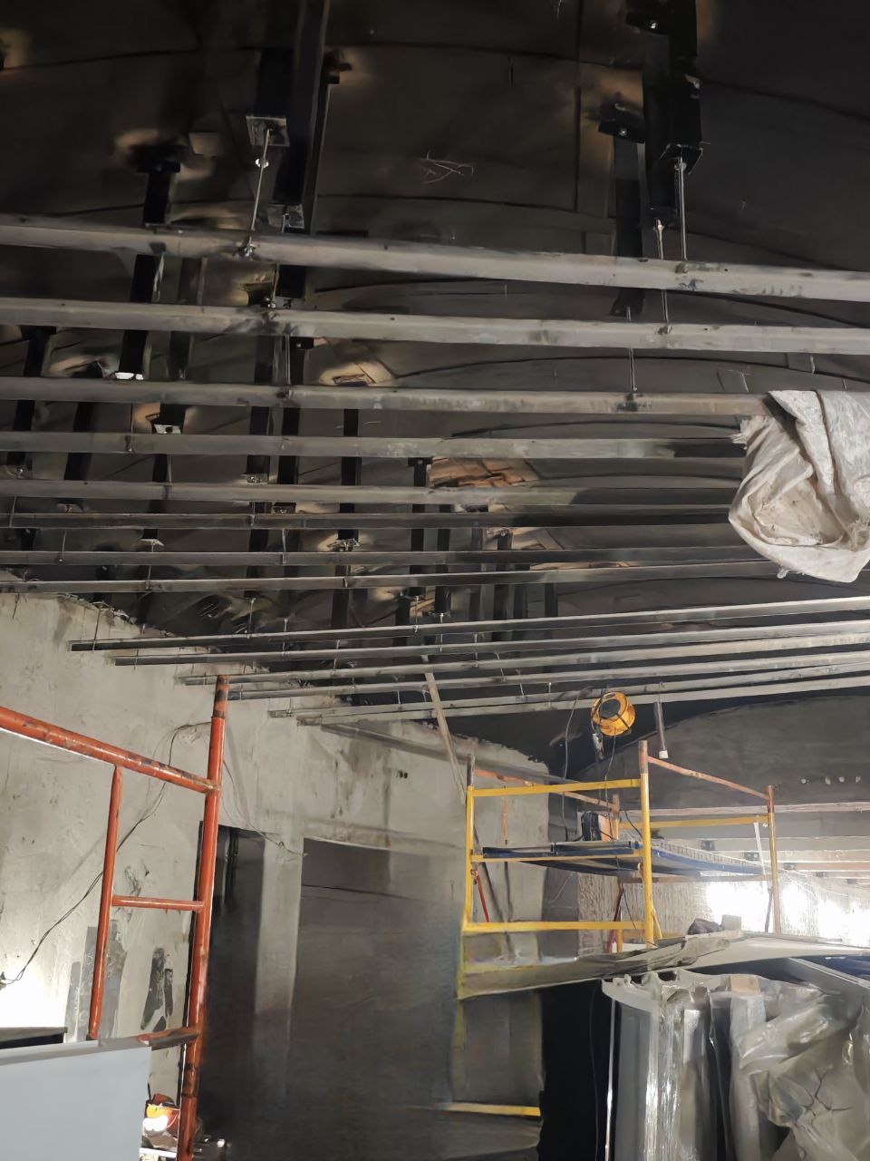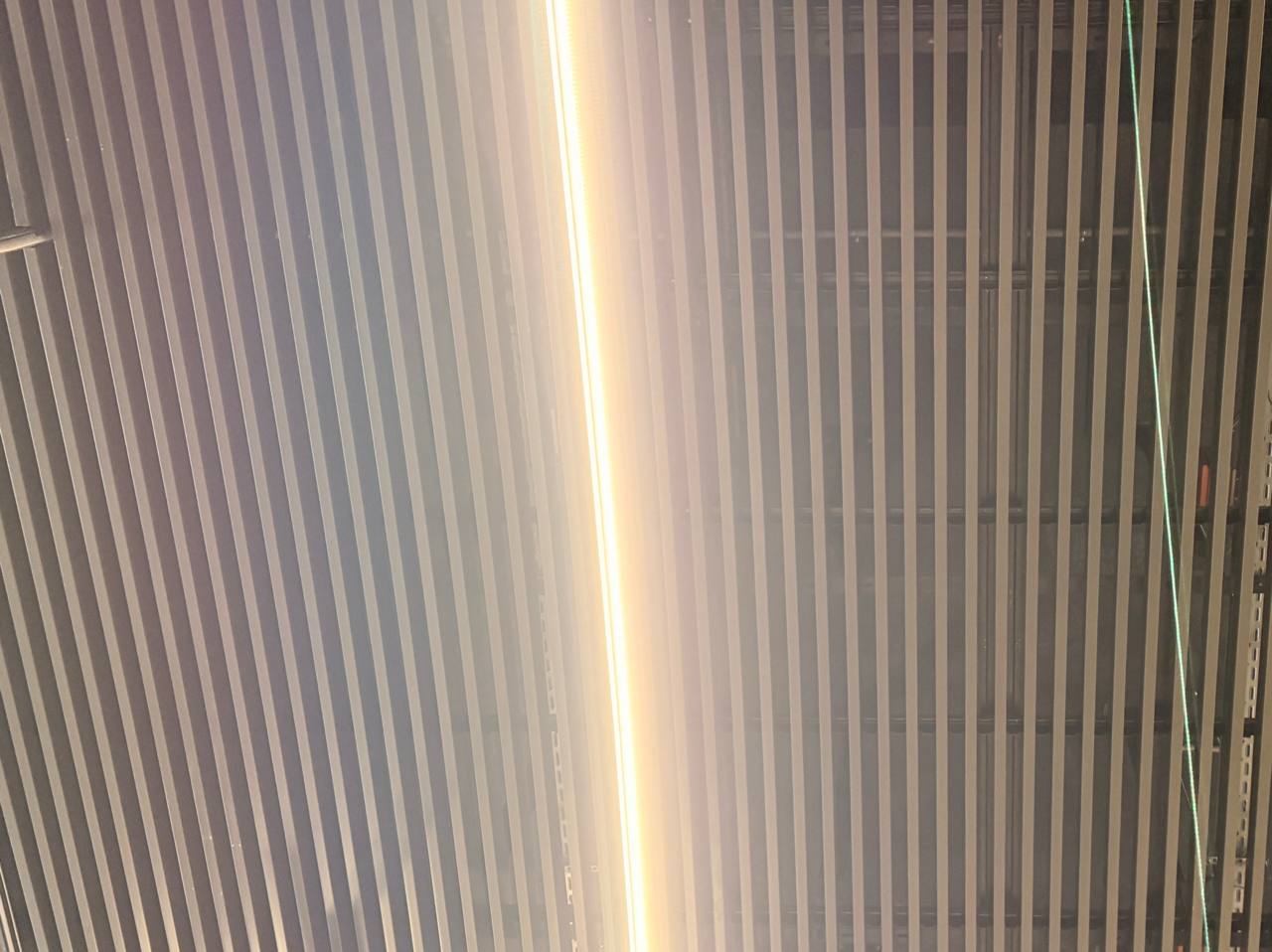 Завершается монтаж серых алюминиевых сотовых панелей на стены зала. Также завершена установка подсистемы и продолжается монтаж подвесного потолка из реек кубической формы (так называемого «кубота»).