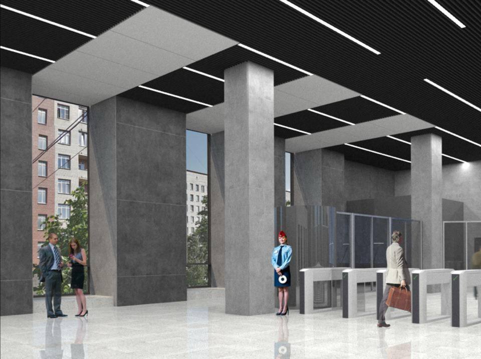 Интерьер вестибюля будет выполнен в серых и чёрных тонах, что подчеркнёт индустриальный стиль. Контраст с приглушённой цветовой гаммой стен создадут большие витражные окна по обеим сторонам зала, наполняющие пространство естественным светом. Одной из ключевых деталей интерьера станет масштабное панно над эскалаторным порталом.