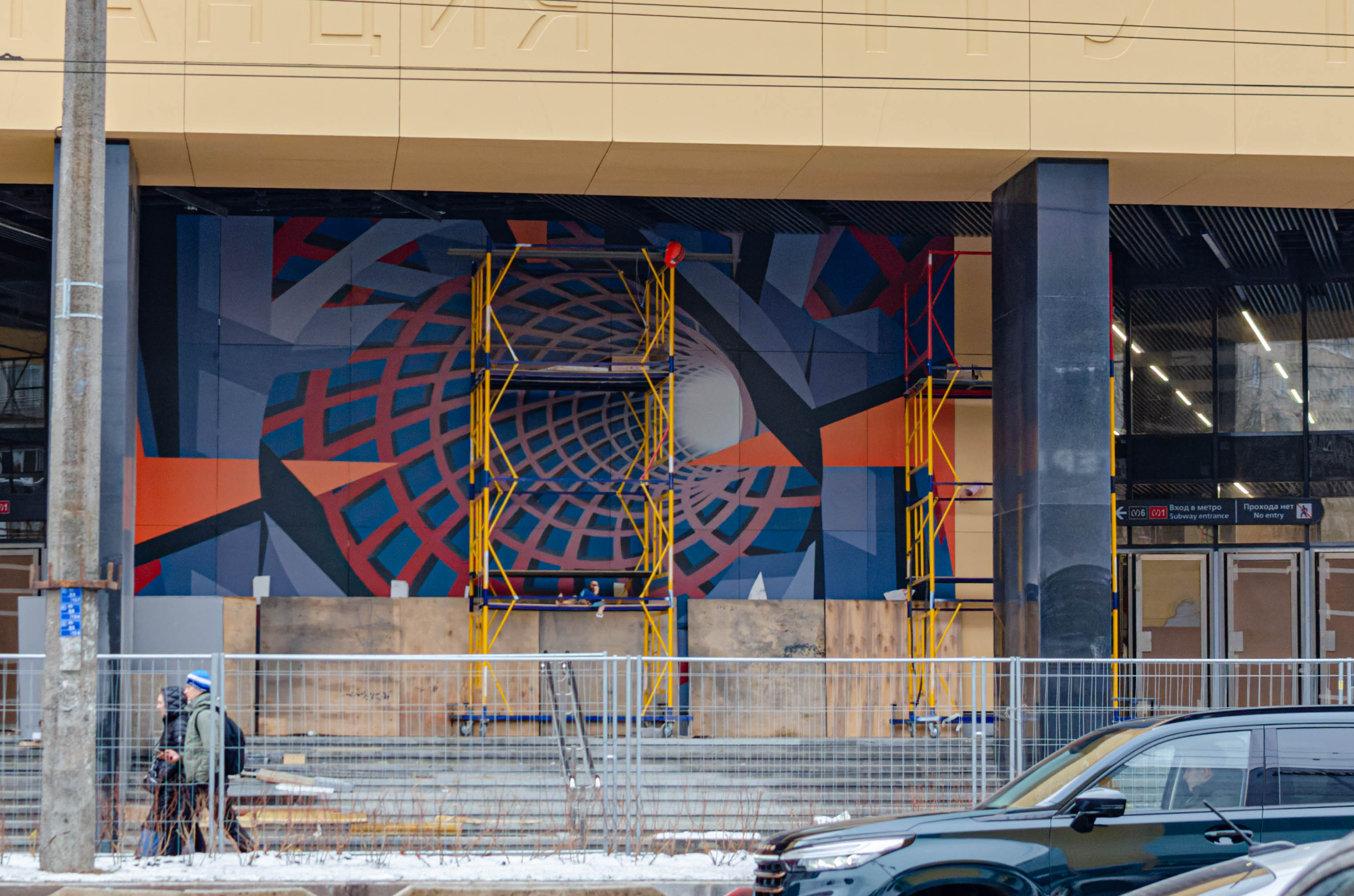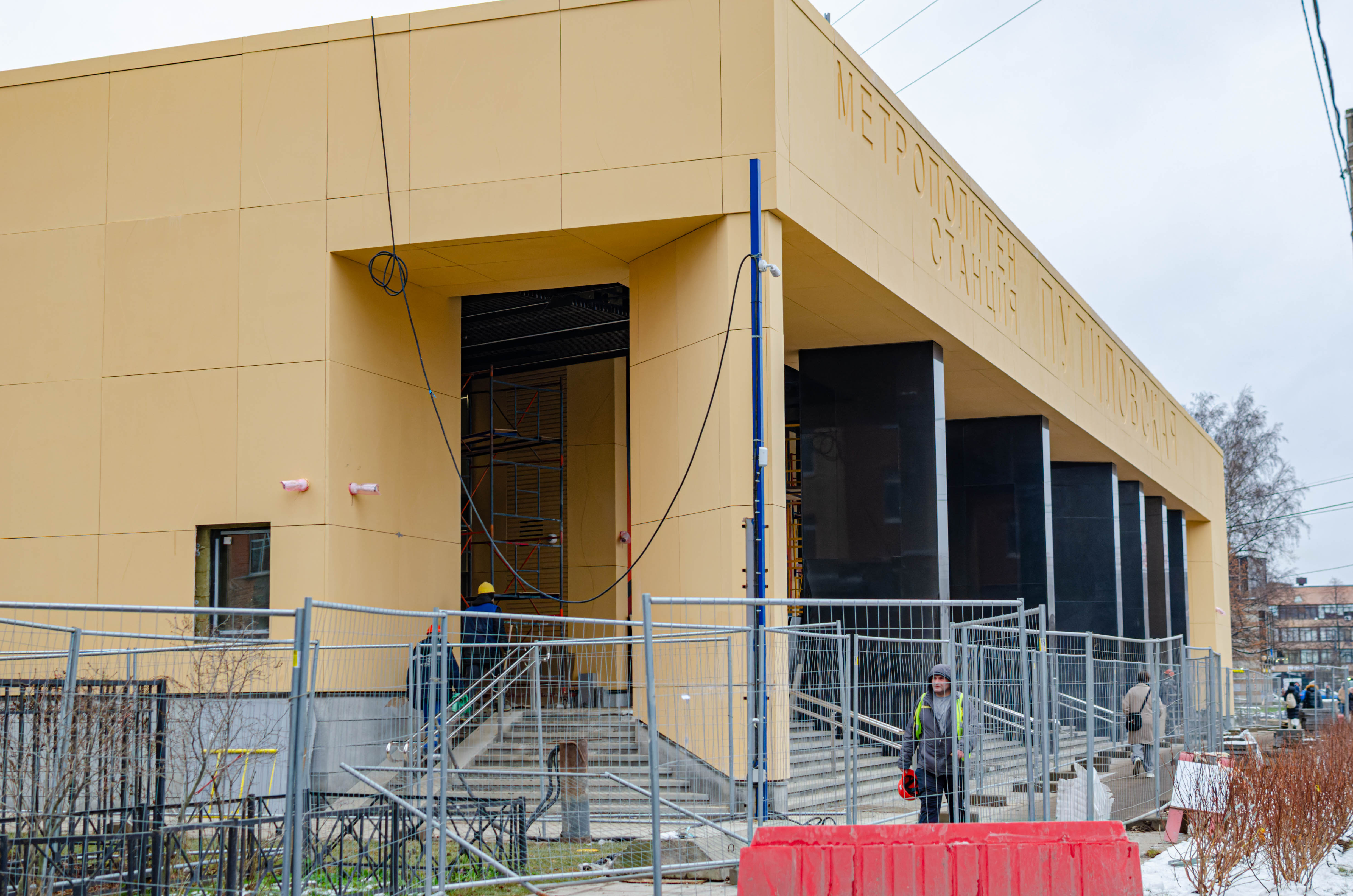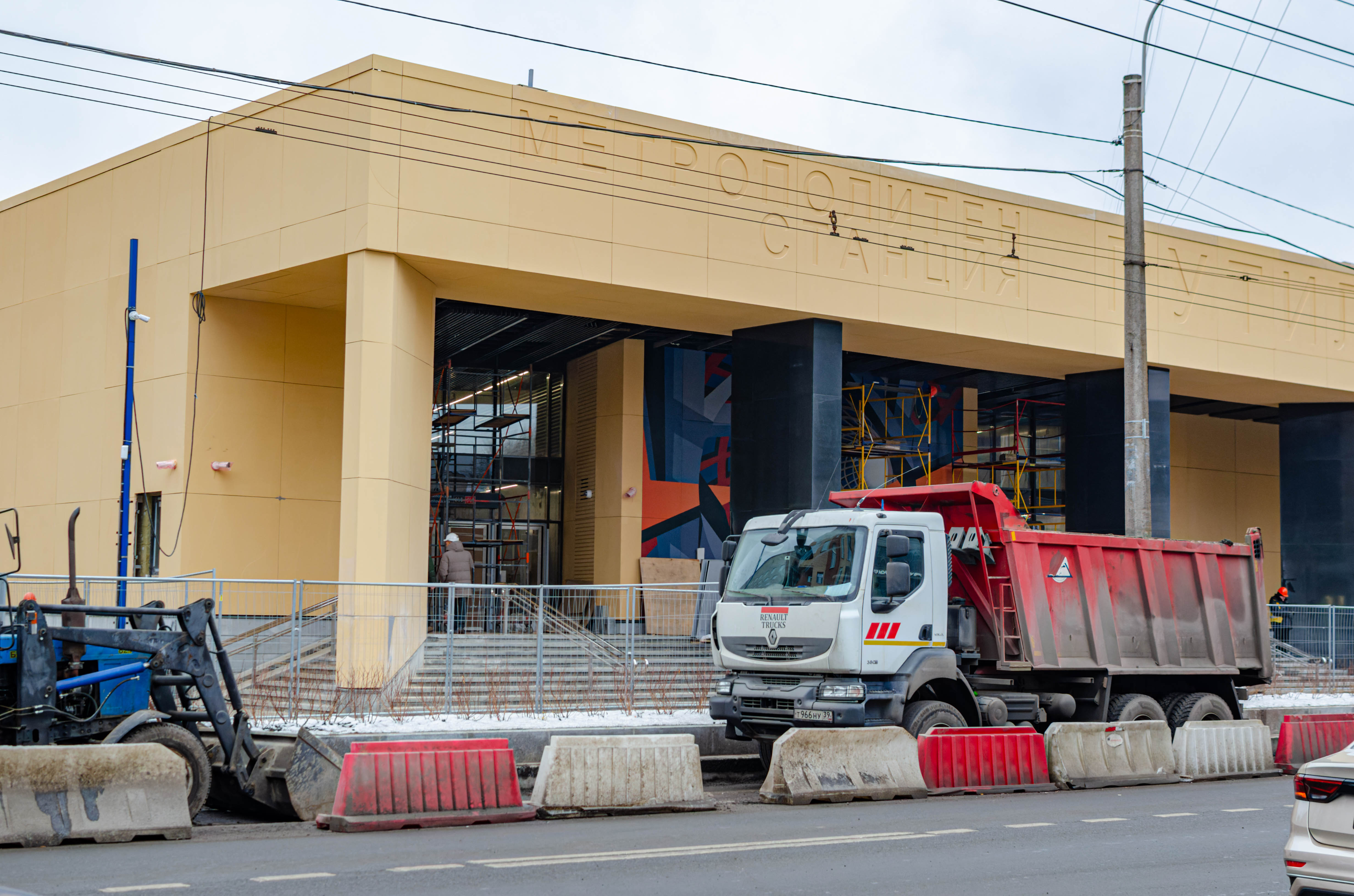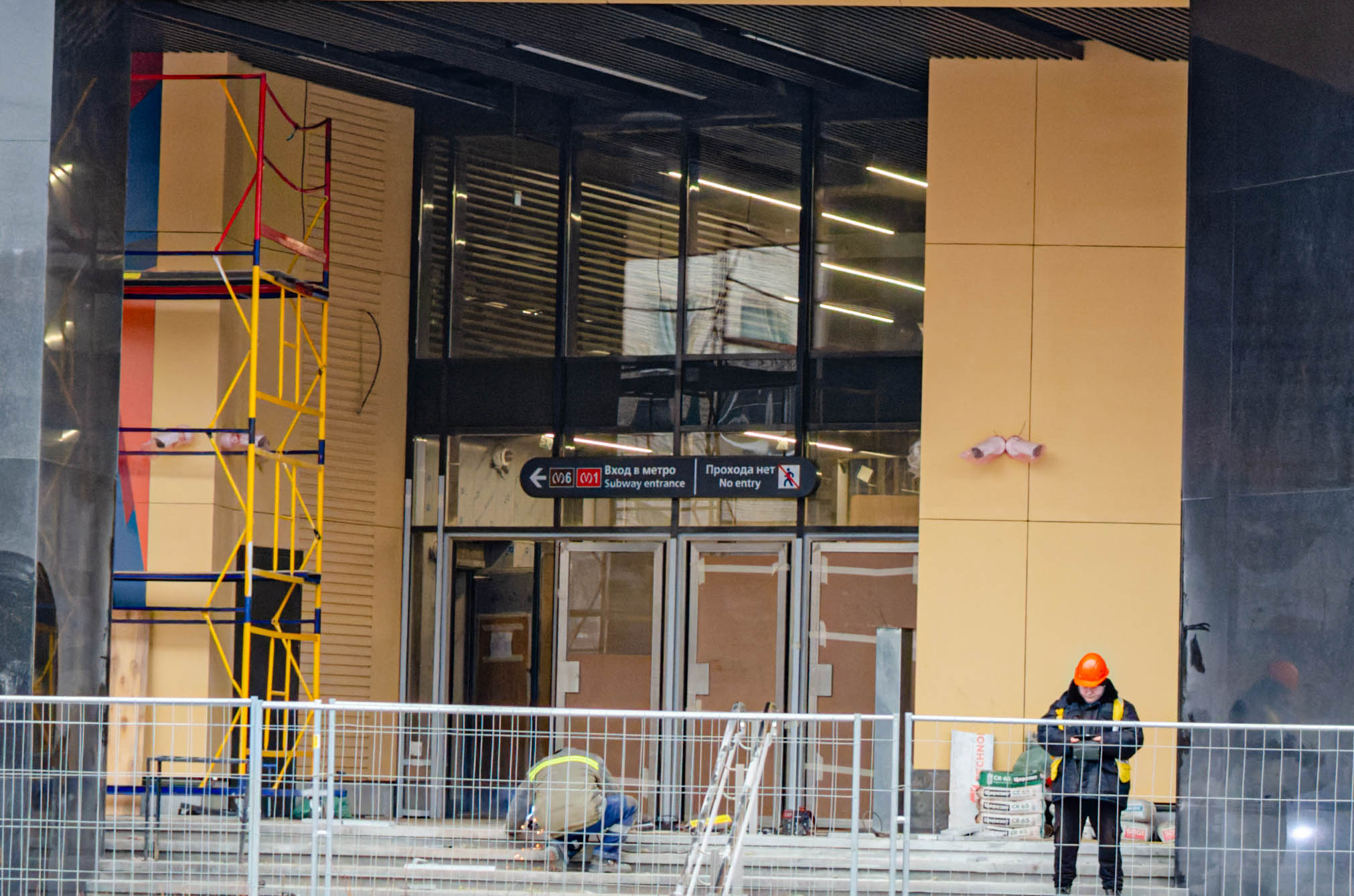 У вестибюля постепенно завершают облагораживание территории вокруг вестибюля, доделан козырёк с задней части здания, начали вешать навигацию.