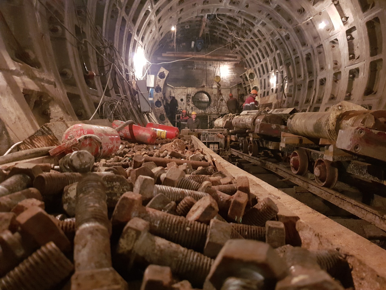 И вот сейчас «Петровна» готовится к своей второй проходке. Ей предстоит соорудить еще 800 метров тоннеля от «Театральной» до «Спасской», теперь уже на правом перегоне. Специалисты Управления механизации демонтировали щит в левом перегонном тоннеле и теперь по частям переносят его в монтажную камеру правого, чтобы там смонтировать и запустить в работу.