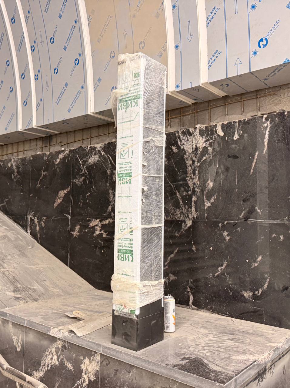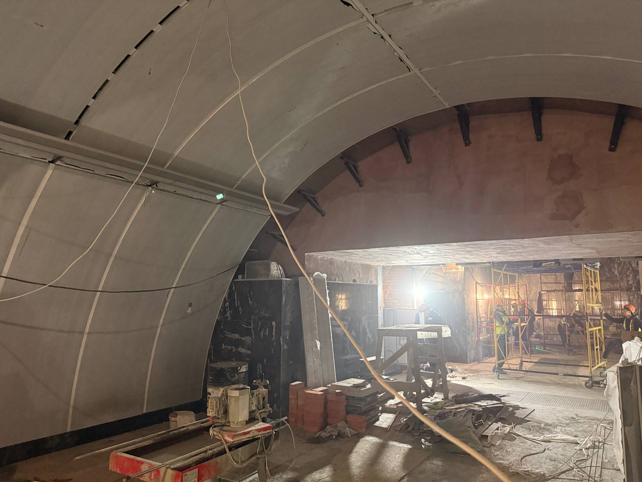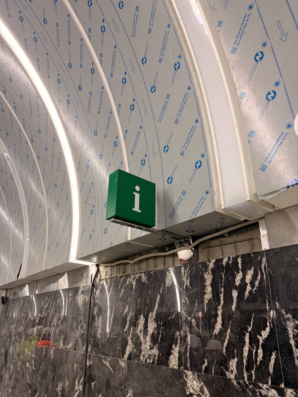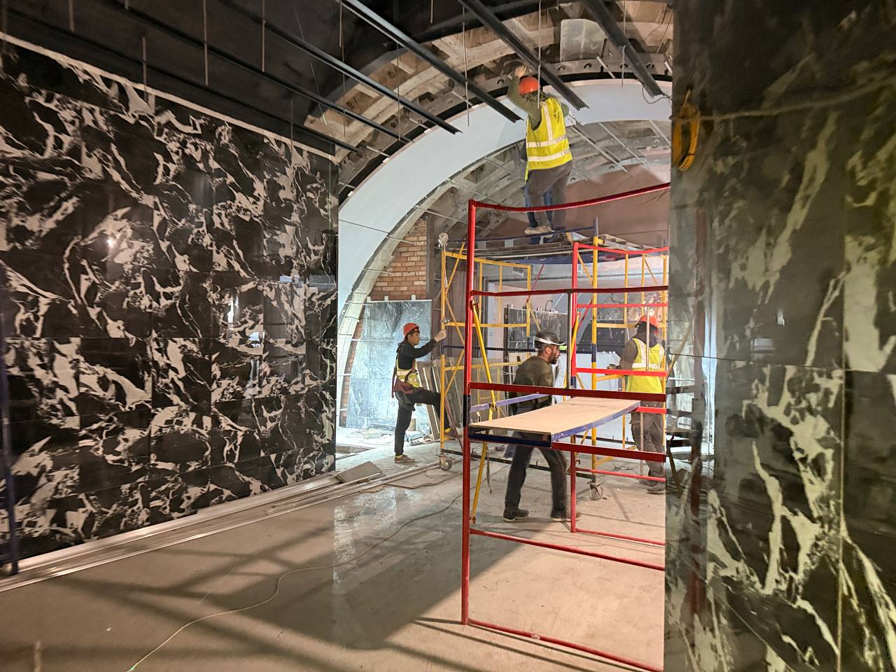 Завершён монтаж серых алюминиевых сотовых панелей на стены зала, приступили к снятию защитной плёнки с панелей. Также завершена установка подвесного потолка из реек кубической формы (так называемой «кубота»). Завершается облицовка колонн чёрным гранитом, переключающимся с колонами входной группы.
