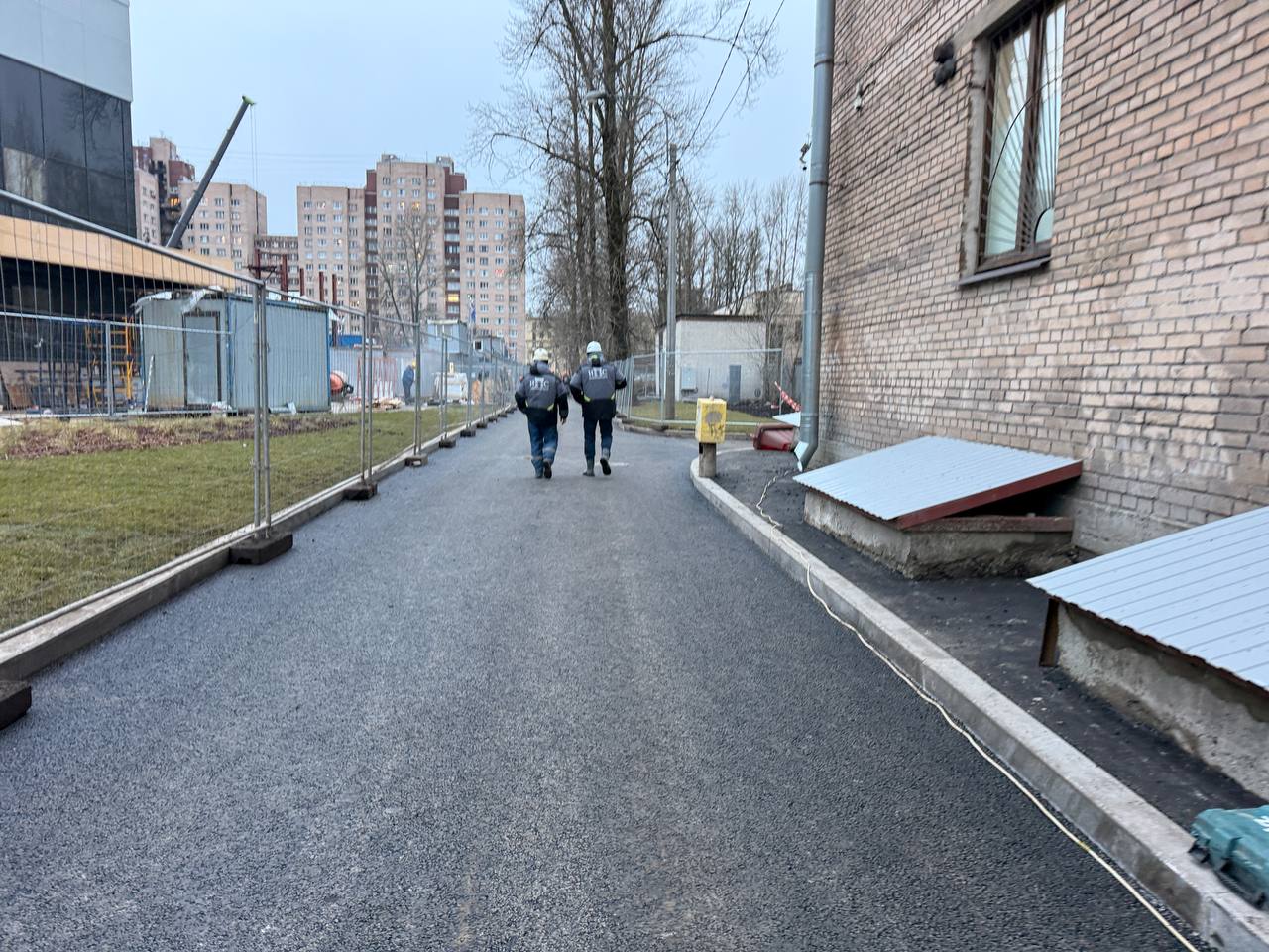 - на участке улицы Васи Алексеева, перед вестибюлем, сняли слой асфальтобетонного покрытия, обустроили зону зелёных насаждений перед главным фасадом и приступили к асфальтированию территории.