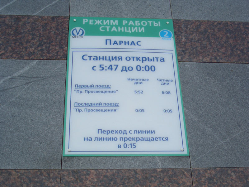 Питерцы! Поздравляю с открытием станции. Сегодня утром вернулся из Питера. Заехал на Парнас. Очень хорошая наземная станция. По сравнению с теми, что у вас есть. Особенно понравилось то, что когда переходил по мостику над путями, в витраж светило солнце. Это создало безумно красивый эффект. ЗЫ. Я так понял, что на Парнас будут ходить каждый третий поезд. Потому что пришлось на Просвете пропустить два состава. ЗЗЫ. Это уже офф, но метро в Питере стало грязней, чем раньше!!! Караул. Скоро будет также грязно, как и в Москве!